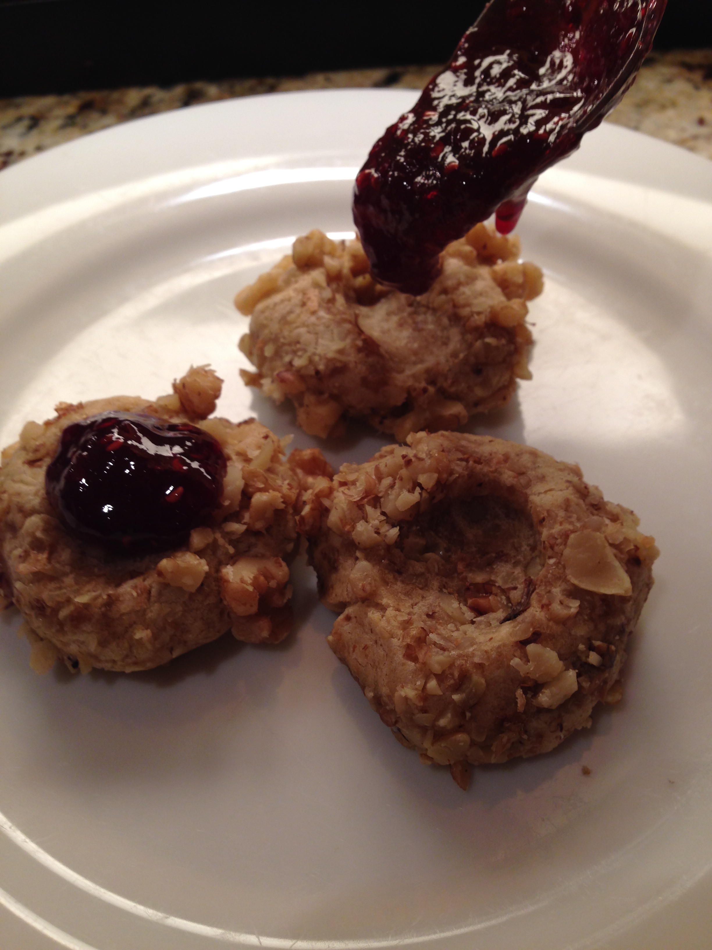 Heat the oven to 350 deg. F. Mix the butter, brown sugar, egg yolks, and vanilla. Slowly add the flour and salt until fully mixed. Easy, right? Now here comes the messy (or fun!) part. Spoon tablespoons full of dough into your hand. Roll dough into balls, dip in the egg whites, and roll in the chopped nuts. Place each ball onto the baking sheet and press your thumb into the center to create a small crater. Bake about 9-10 minutes until lightly browned. Immediately remove them from the baking sheet and place on a cooling rack, as the nuts will start to stick to the pan otherwise. Let the cookies cool a bit and fill with a drop of jelly when ready to eat!