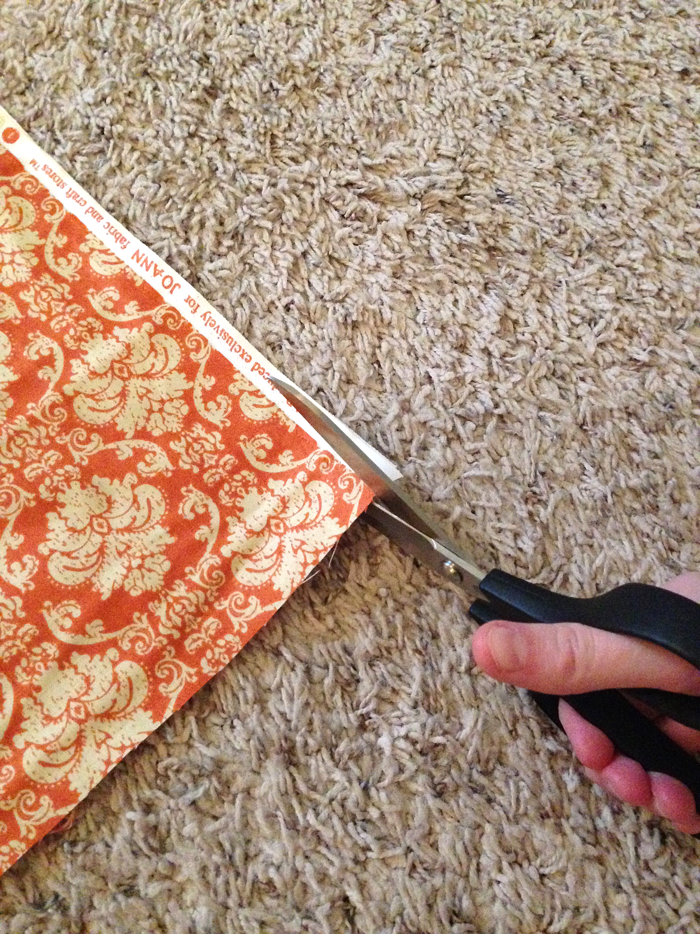 3. Find a large space and lay out the fabric. Start by using your scissors to cut the selvage edge off of both sides of the fabric. Then fold the fabric in half and cut into two panels.