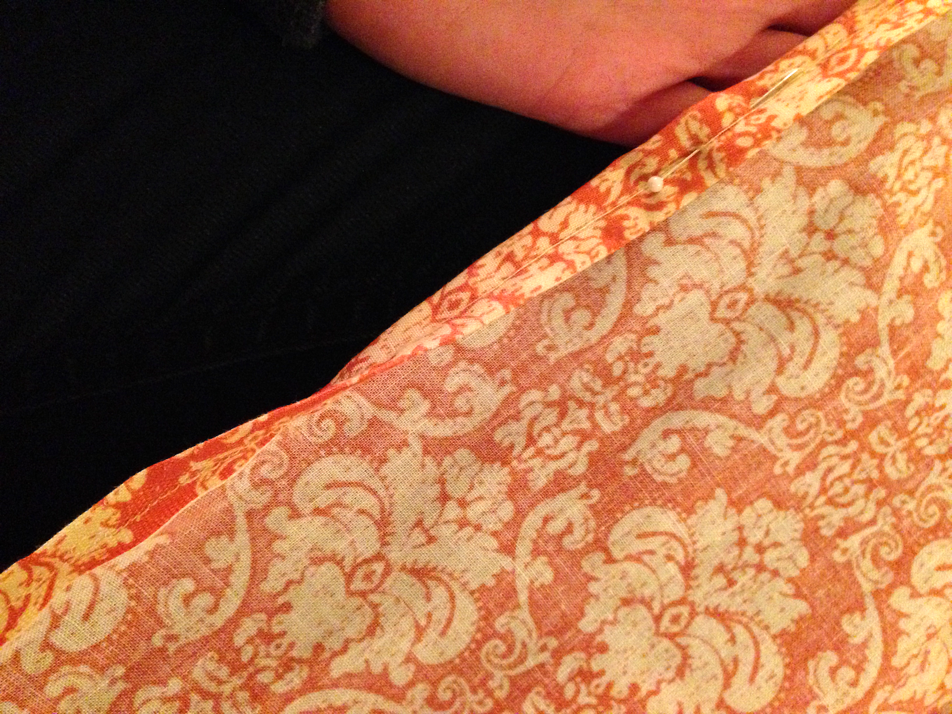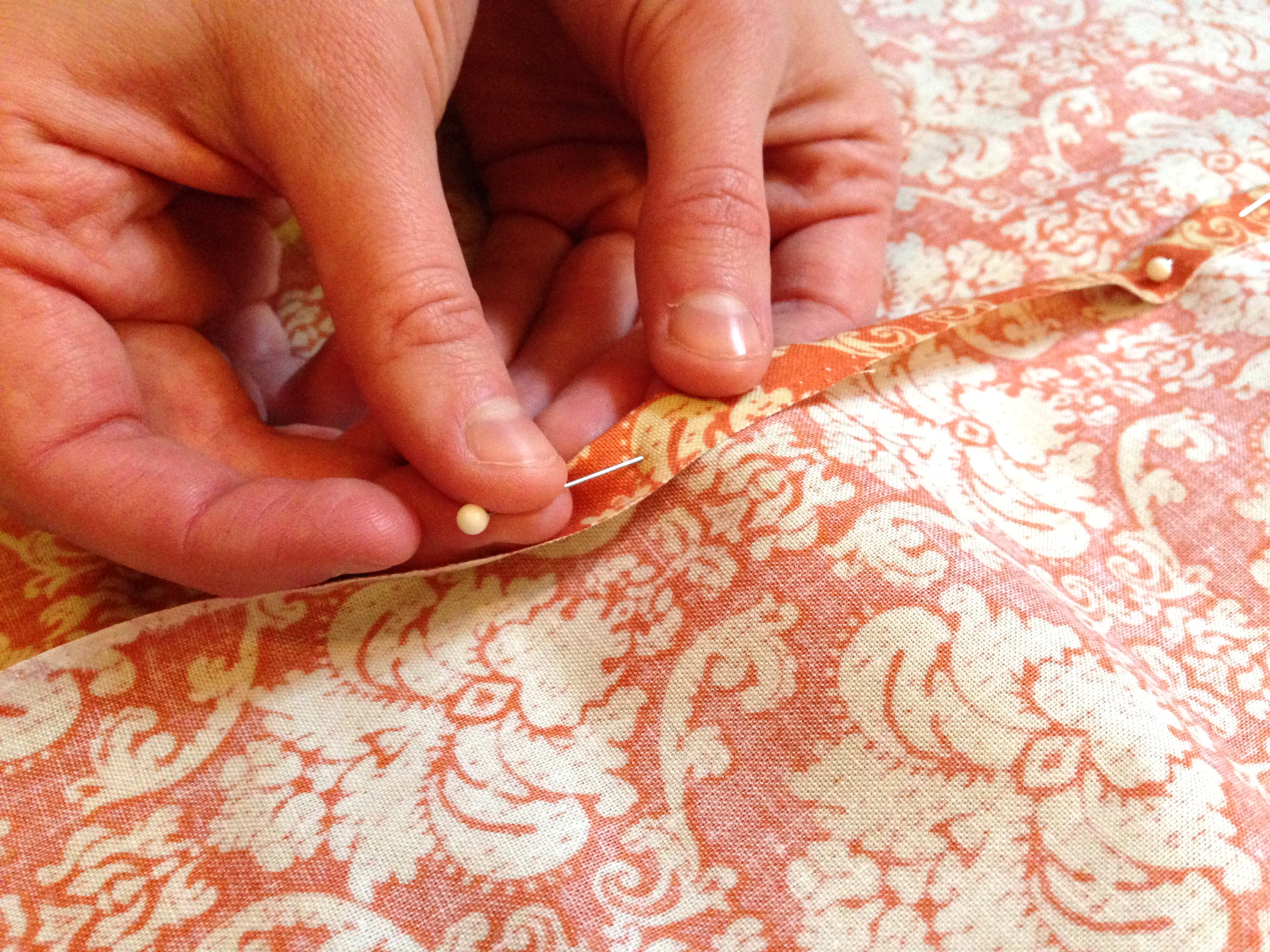 4. Time to start the pinning marathon! Fold the long sides of each panel 1/4″ over and pin about every 6″ down. (Also check out this adorable teacup pin cushion my friend Jen made for me, tutorial here!)