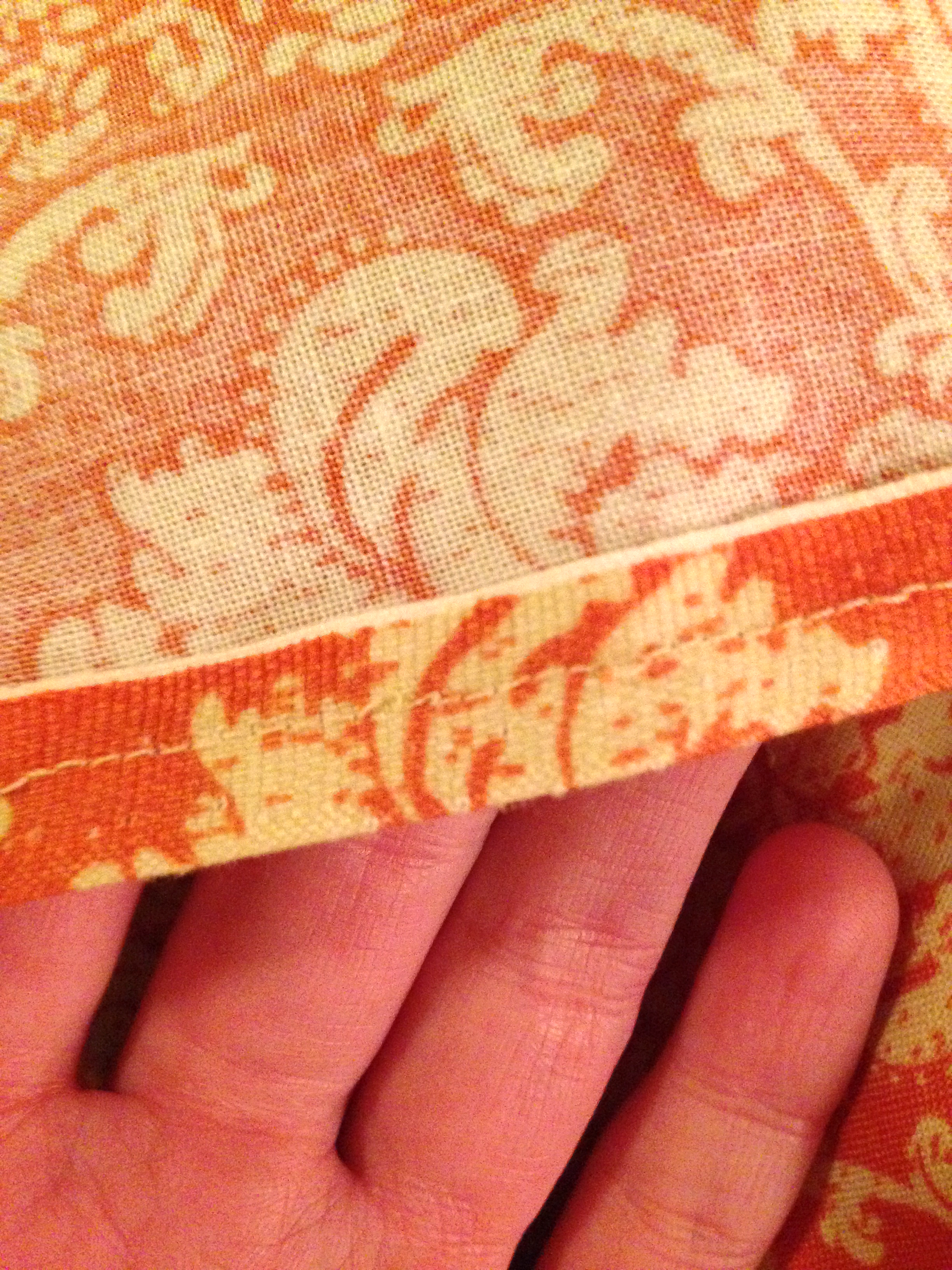 5. Set up your sewing machine and line up the needle about a 1/4″ from the edge of the fold. Sew, sew, sew! These sides are honestly the hardest part just because they are so long. Take tea breaks as needed.