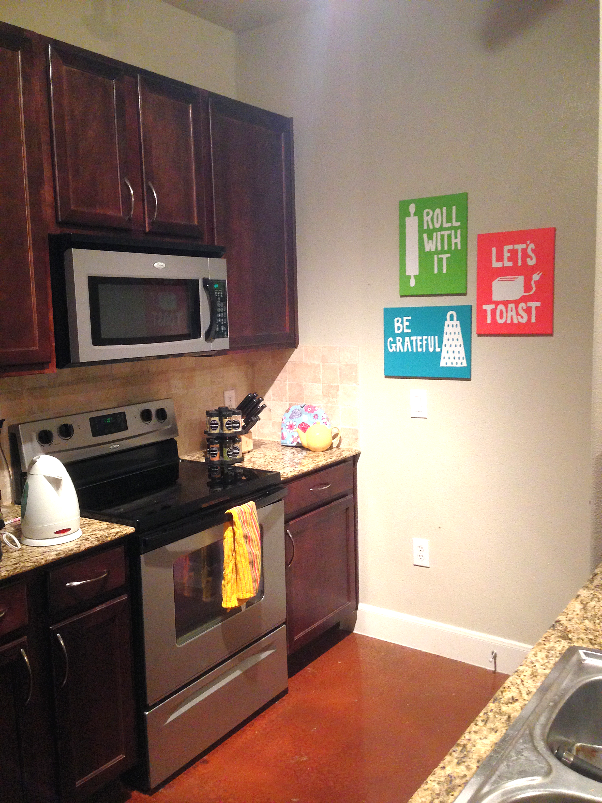 5. Once dry, you can peel the tape off and hang these art pieces up on your wall! I made a few different kitchen signs and hung them in a group, but they are just as cute by themselves. Happy crafting!