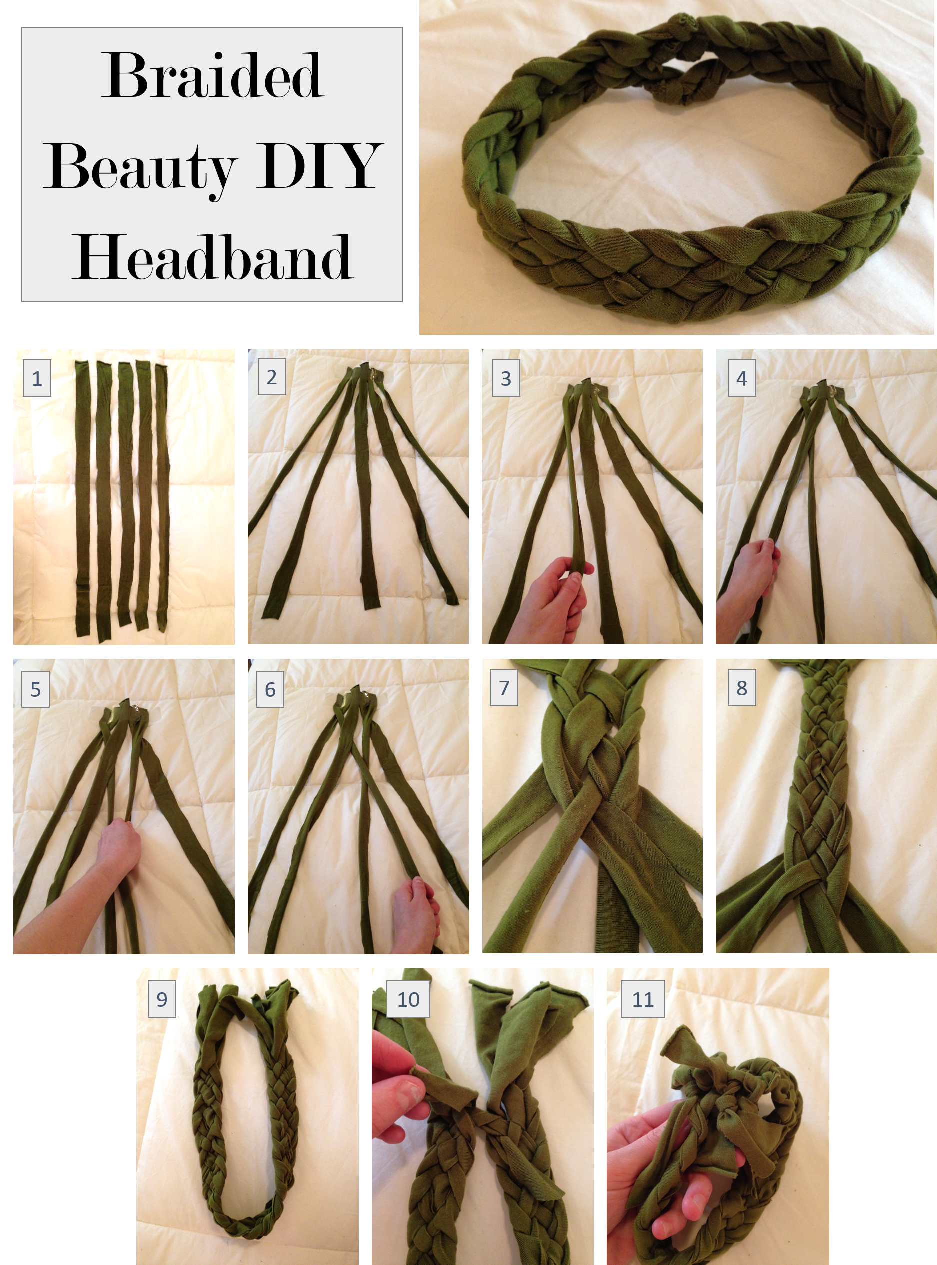 Grab some cotton fabric with spandex in it so it has some good stretch. Cut 5 strips about 1″ wide by 24″ long. Tape the 5 strips to a table at one end and follow the braiding pattern above. It’s essentially making a braid with the left three pieces and then making a braid with the right three and repeating. Bring the ends together by tying each piece to one of the others at the opposite end of the headband. Make sure they are pulled tightly. Cut the extra fabric off, throw it on and get down to the pool!