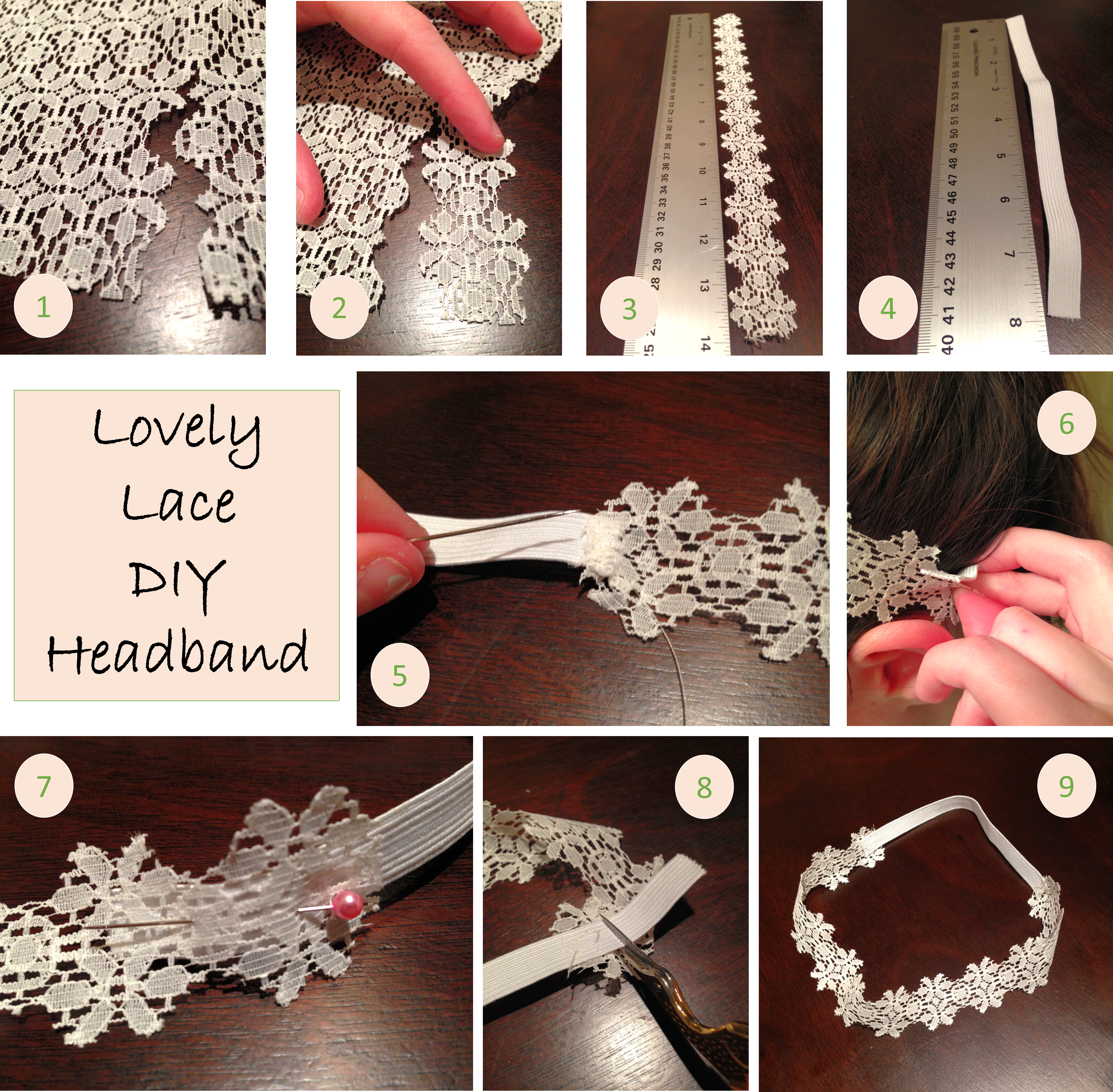 Find a piece of lace with a pattern that can be cut in a linear fashion. The lace I used has a very linear repeating pattern which made it easy to create a headband out of. Cut a piece of the fabric about 14″ long. Carefully cut around one section of the linear lace pattern to get some pretty edges of the lace showing. (A 14″ long piece of lace ribbon also works!) Cut a piece of white elastic about 8″ long. Sew the elastic to one end of your 14″ lace piece. Make sure to sew through the elastic and the lace, going back and forth along the width of the elastic a few times.Wrap the lace and elastic around your head and stretch the elastic until it feels snug. Pin the lace to the elastic at this point and remove from your head. Sew up the second end of the elastic and you’re done!