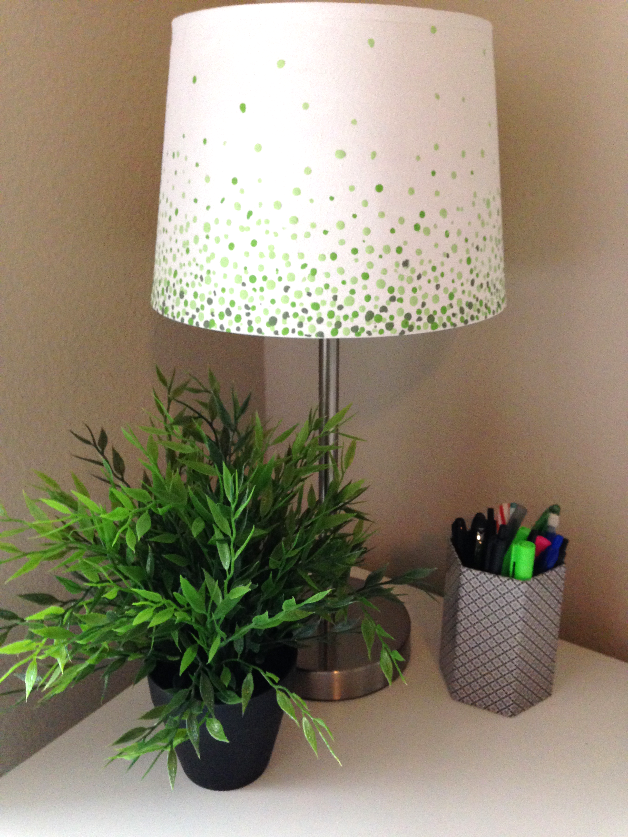 I came up with this green, dotted, ombré pattern that fades from dark green to light green from the bottom to the top of the lamp shade. I like this pattern because it’s clean and simple, and it allows light to come through the shade because it’s mainly white. You can use paint to make any sort if cute decoration on a shade: chevron, solid, stripe… But make sure to remember that light colors always work best for a lamp shade, otherwise you don’t get much light when you turn it on!