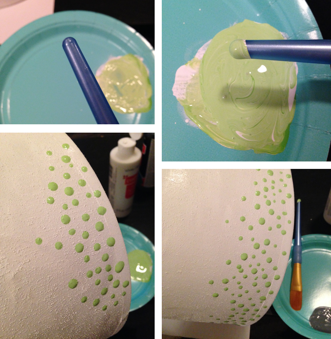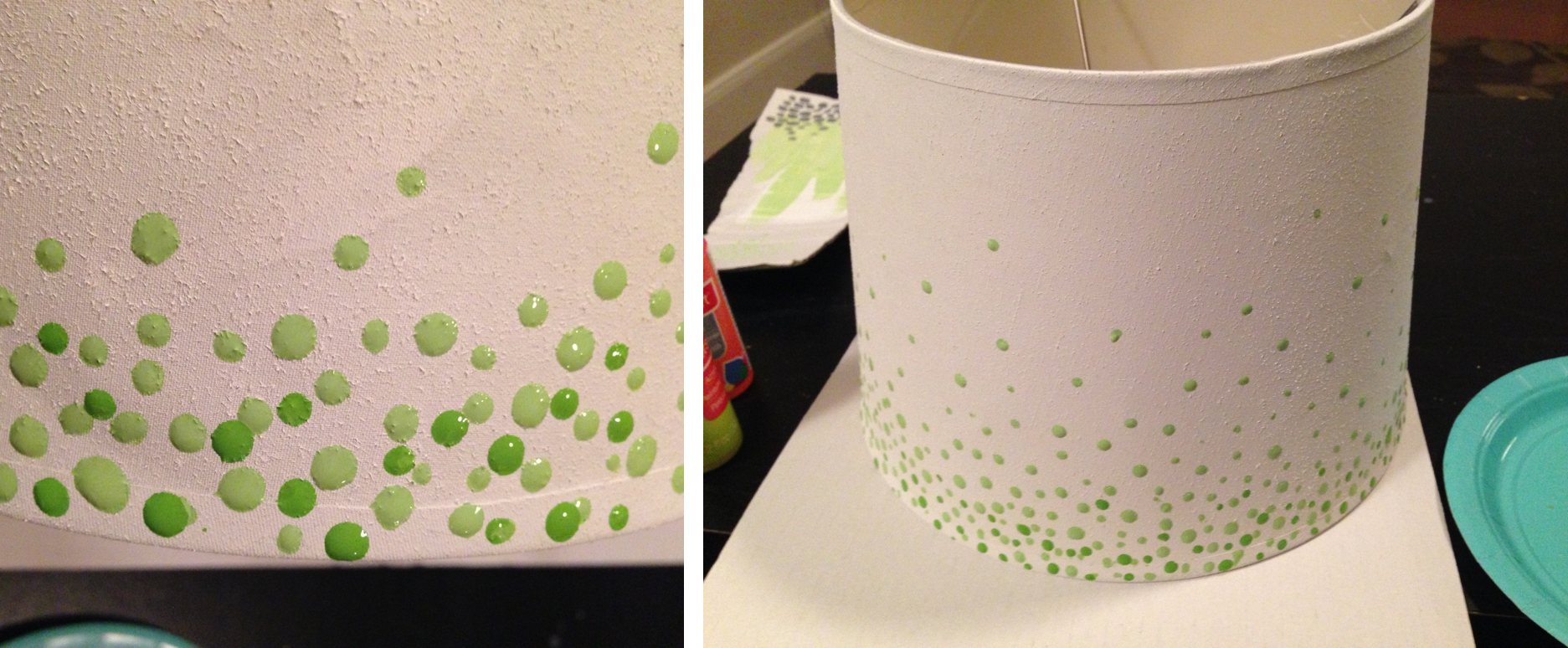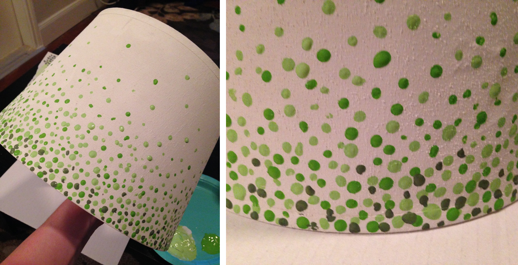 To copy my pattern, start by mixing the green paint with some white on a paper plate. This will be the lightest shade. Use the end of the paint brush and dip it into the paint. Start placing dots sporadically all over the bottom of the shade with less dots more openly spaced as you move up the shade. The more random it is and the more sizes of dots you make, the better. Continue your way around the entire shade until you have come back to the start.