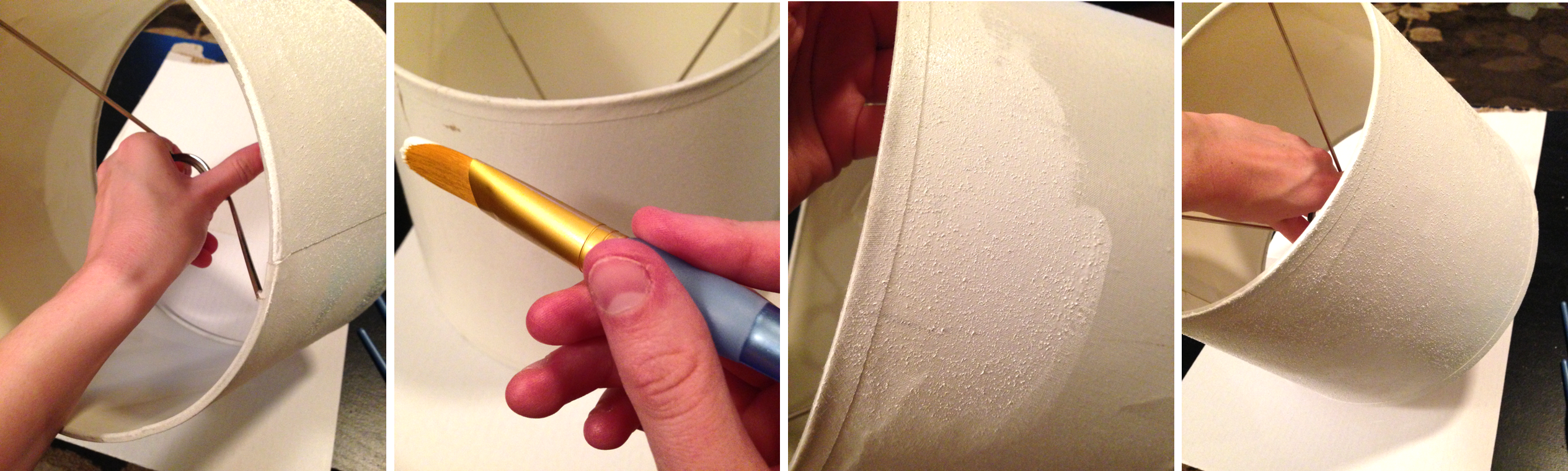 2. Hold the shade by the inner wires to prevent any more “dentifying”, and paint a thin coat of white paint over the entire surface. If there are dark stains on your shade wait for the first layer of paint to dry and paint another coat. Allow all coats of paint to dry.