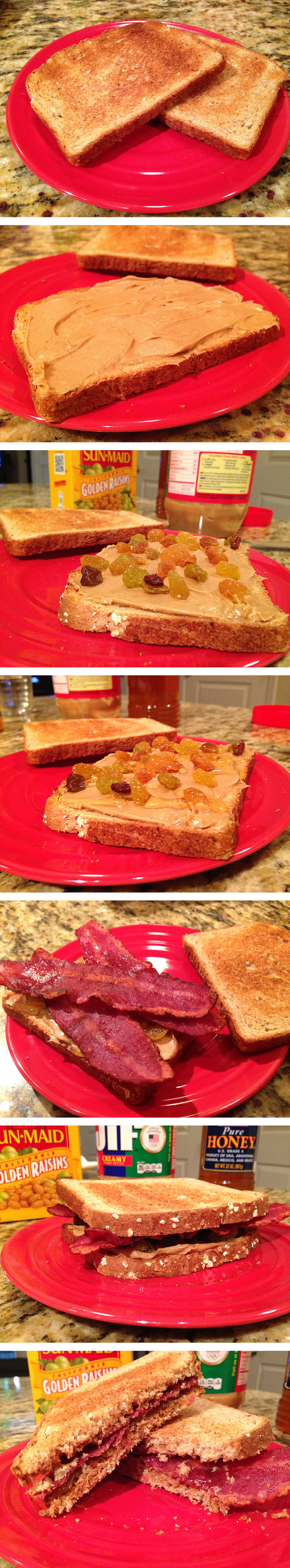 Meanwhile, start to assemble your sandwich. Slather on the peanut butter. Sprinkle on the golden raisins. Generously drizzle the honey (Might I suggest lots of honey). Place on your turkey bacon. Top with another slice of bread.