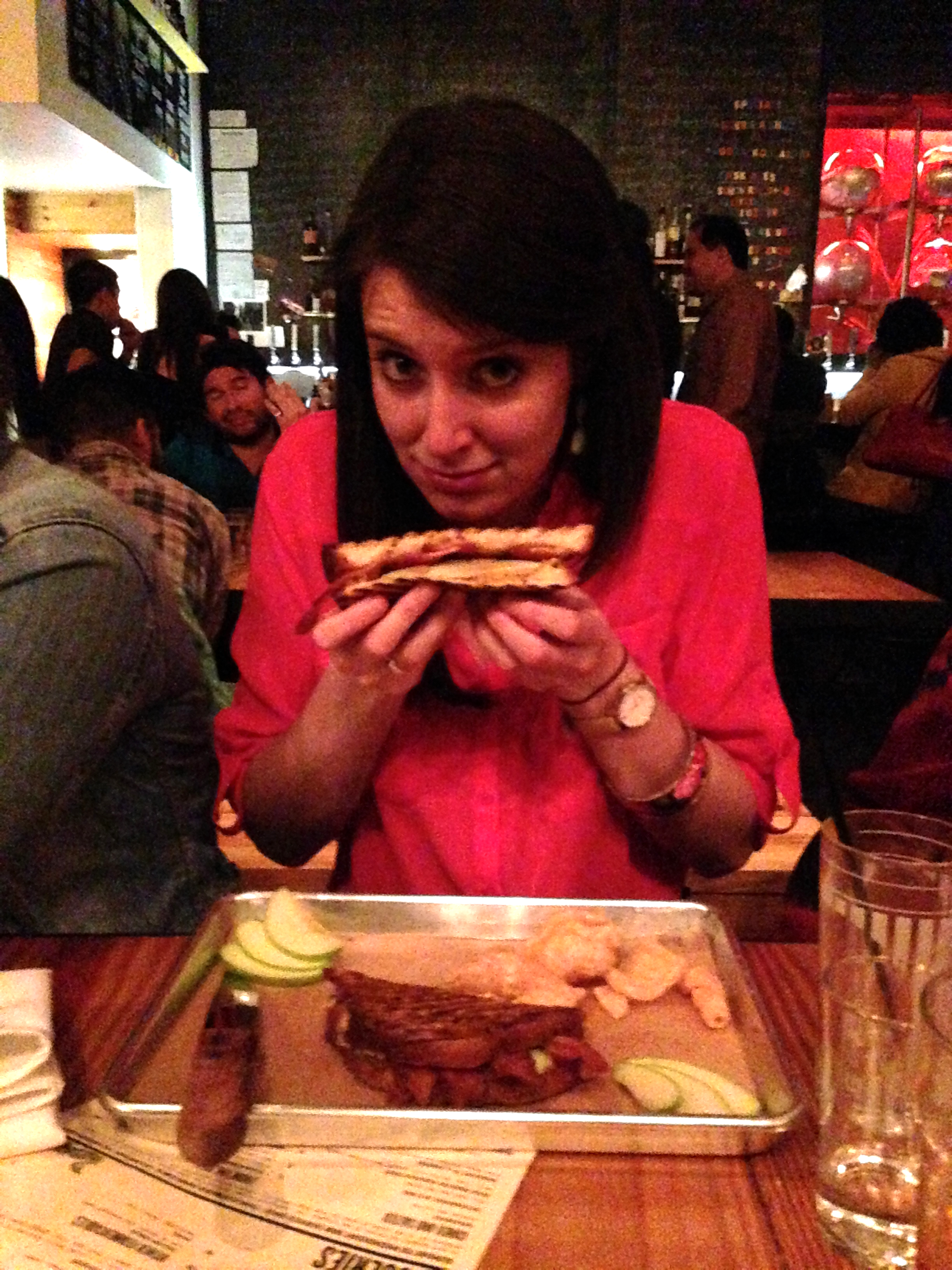 Honestly, it was the perfect plate for a hungry girl after a couple of drinks, but I knew I couldn’t make this sandwich a habit. The monster comes loaded with peanut butter, drunken golden raisins, a generous drizzle of honey, and greasy bacon all mushed between two thick slices of jalapeño challah bread….Take a moment, I understand. Some crunchy Granny Smith apples come on the side as a nice contrast to the sticky sandwich, but they in no way make this delight incredibly healthy.