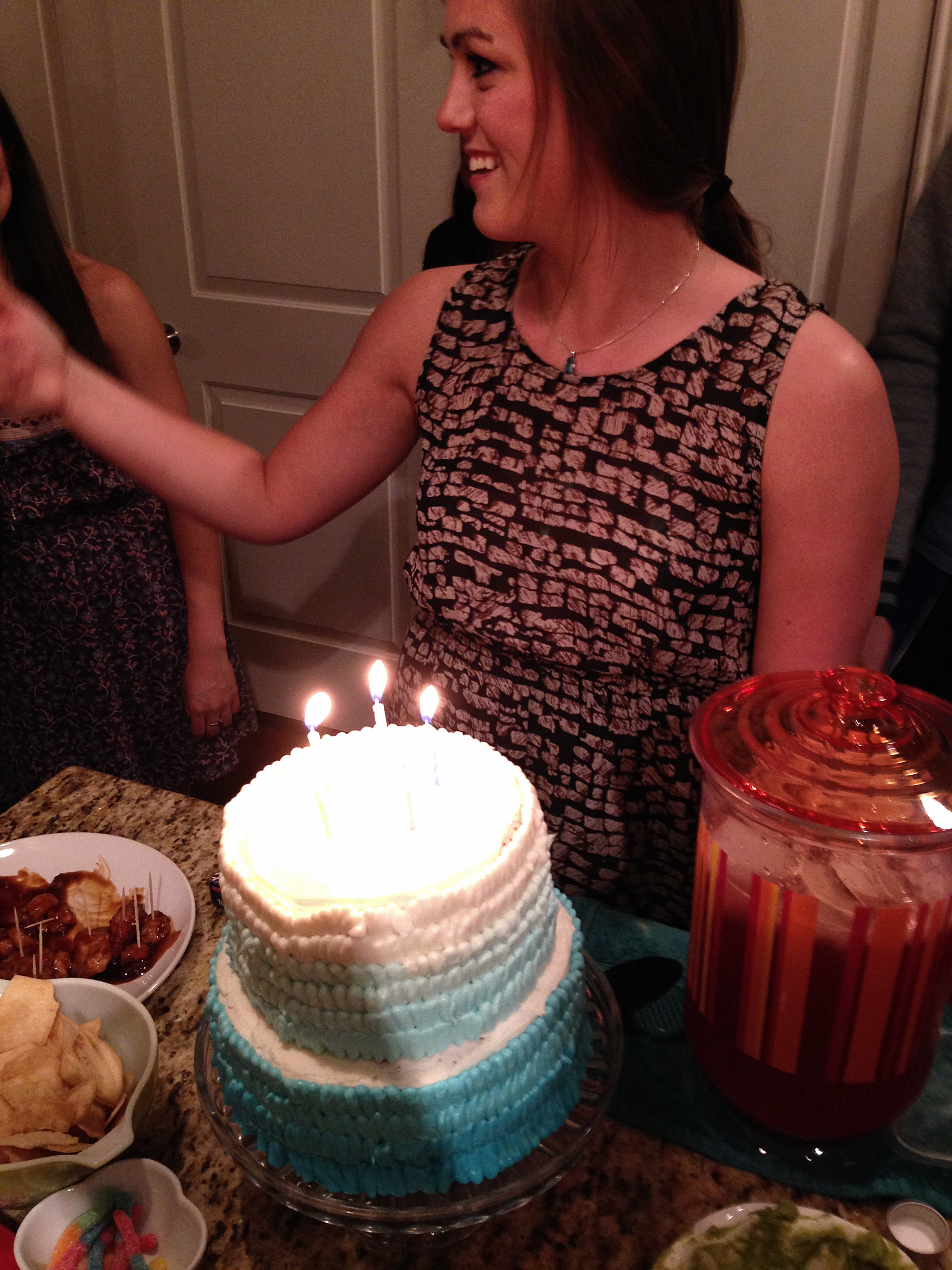 It was Megan’s birthday in early May, so obviously we started cake brainstorming in April. She doesn’t love really girly things, so pink flowers were pretty much out of the question. What we settled on, instead, were ruffles, ombré ones to be exact! Making ombré frosting is super simple because you only need one color for food coloring and a simple batch of plain frosting. The ruffle pattern is also a good starter decorating pattern because it’s pretty forgiving, it’s just a lot of squiggles all layered on top of one another so if you need to stop for a tea break you can’t really tell where you stopped.