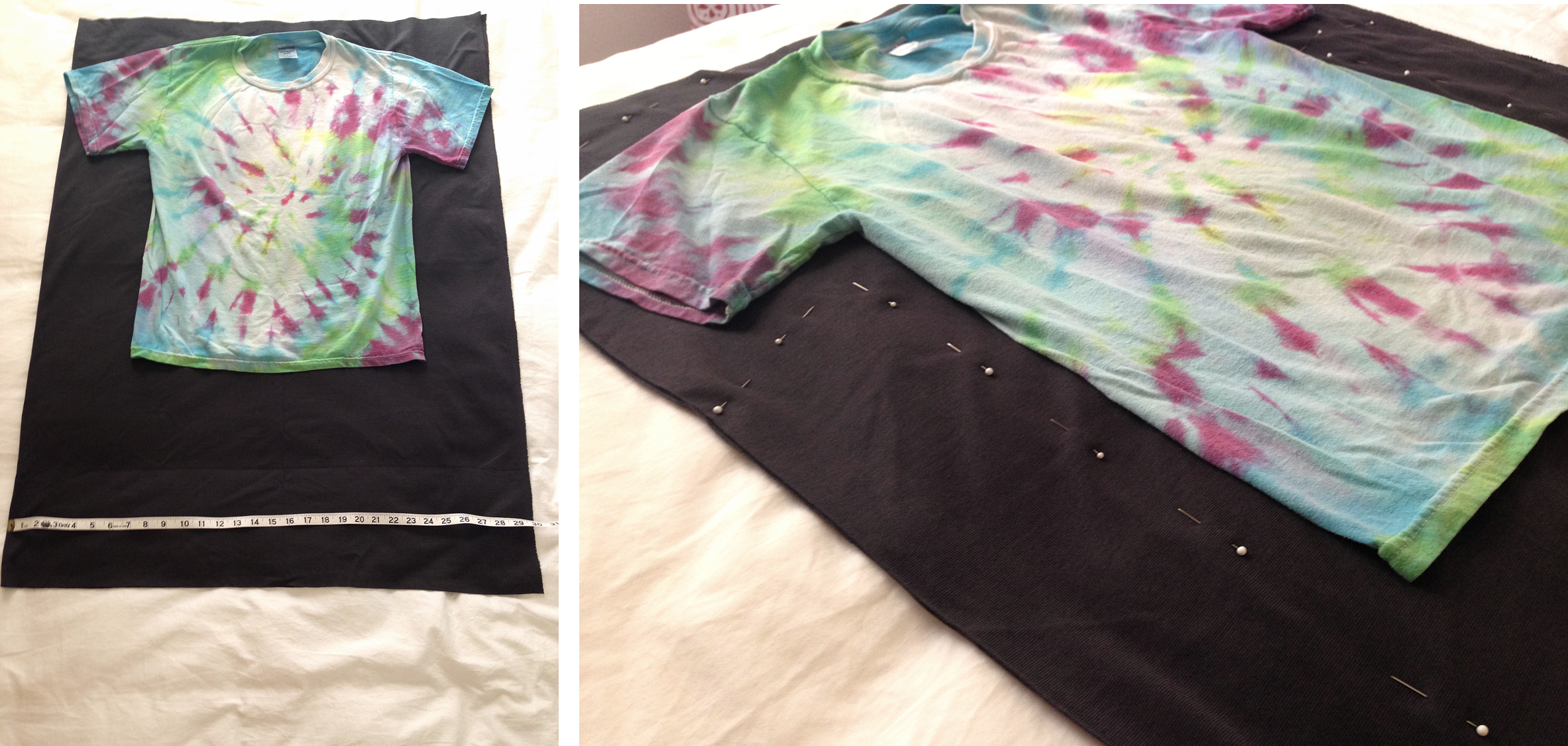 1. Fold your fabric in half lengthwise and cut along the fold (the fabric should now measure 3′ by 2.5′ in two pieces). Grab an old comfy tee-shirt. It should fit you, but not be super tight. Take your tee and lay it over the fabric that is layered one on top of the other. Pin around your tee-shirt about 1″ from the edges, also extending sides of the shirt down to make the length of the dress.
