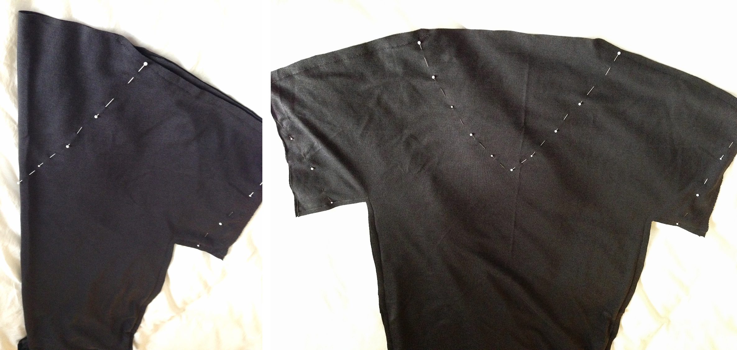 3. At this point we start to make some moves on styling. Fold the dress in half so the sleeves line up. Mark a point about 5″ from the center of the dress on the neck on both sides of the fabric with pins. This will be where your v-neck goes. Unfold your dress and pin from each point on the neck downward about 8″ to a point to make a V. Also pin along your sleeves to make them square. Cut along all of these lines, making sure that you only cut the v neck on one layer of fabric (the back of the dress will stay round).