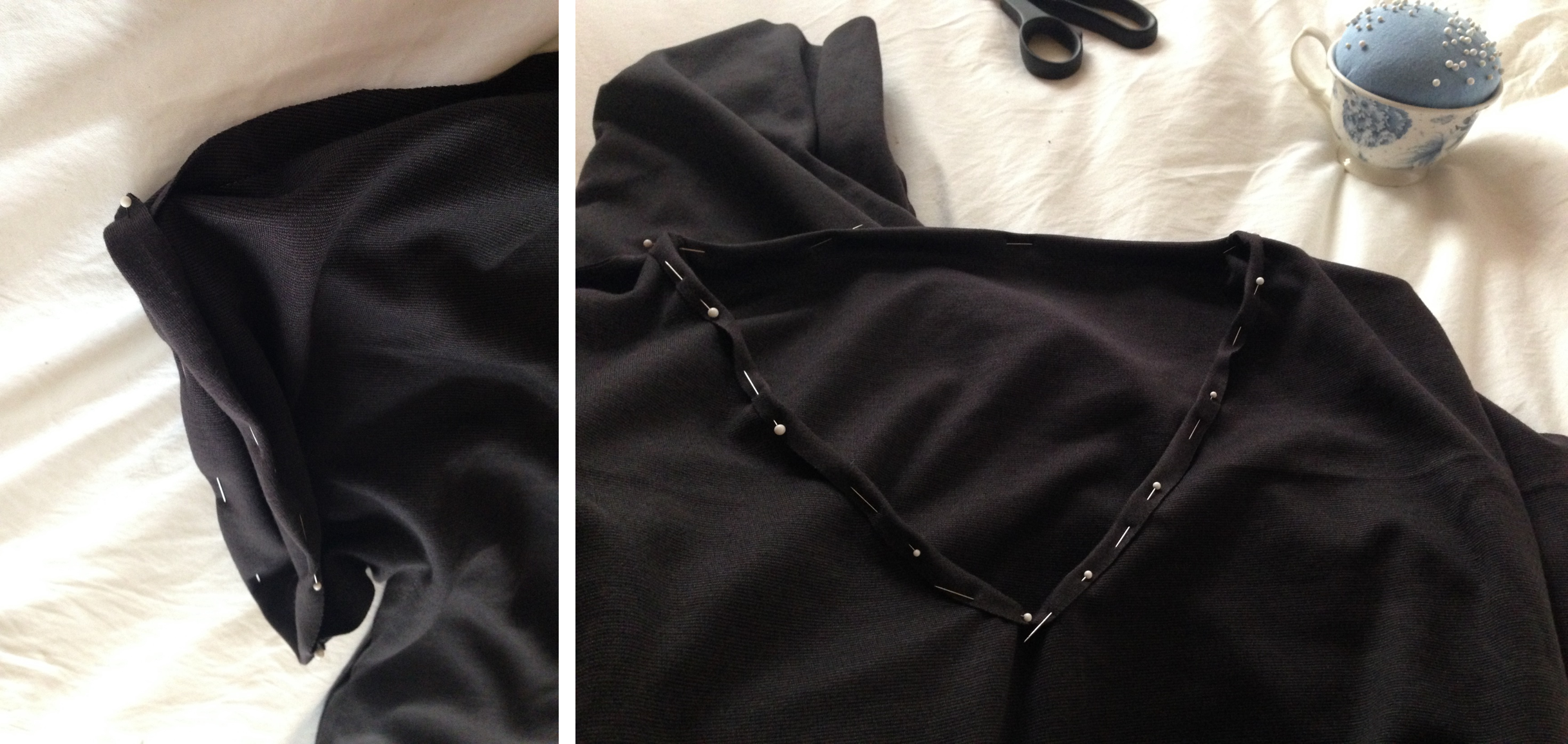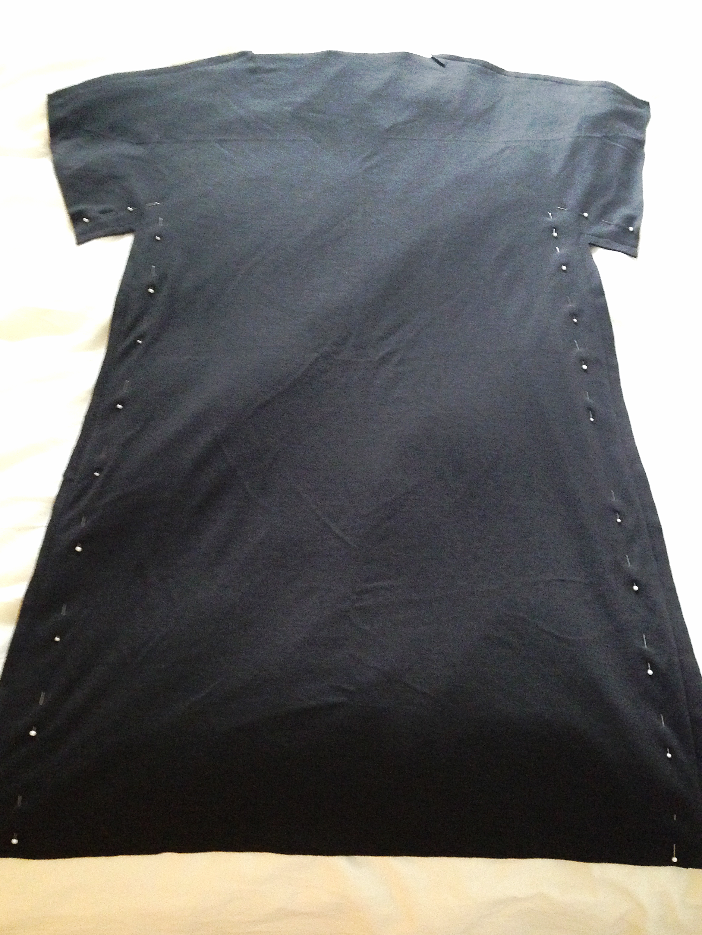 4. After having tried on the dress, chances are you’ll realize it needs to be taken in. I took mine in about an inch on each side. Pin in an inch from the original seams all the way down the sides of the dress and sew along the pins. I also took the sleeves in about an inch as well, as you can see in the picture below.