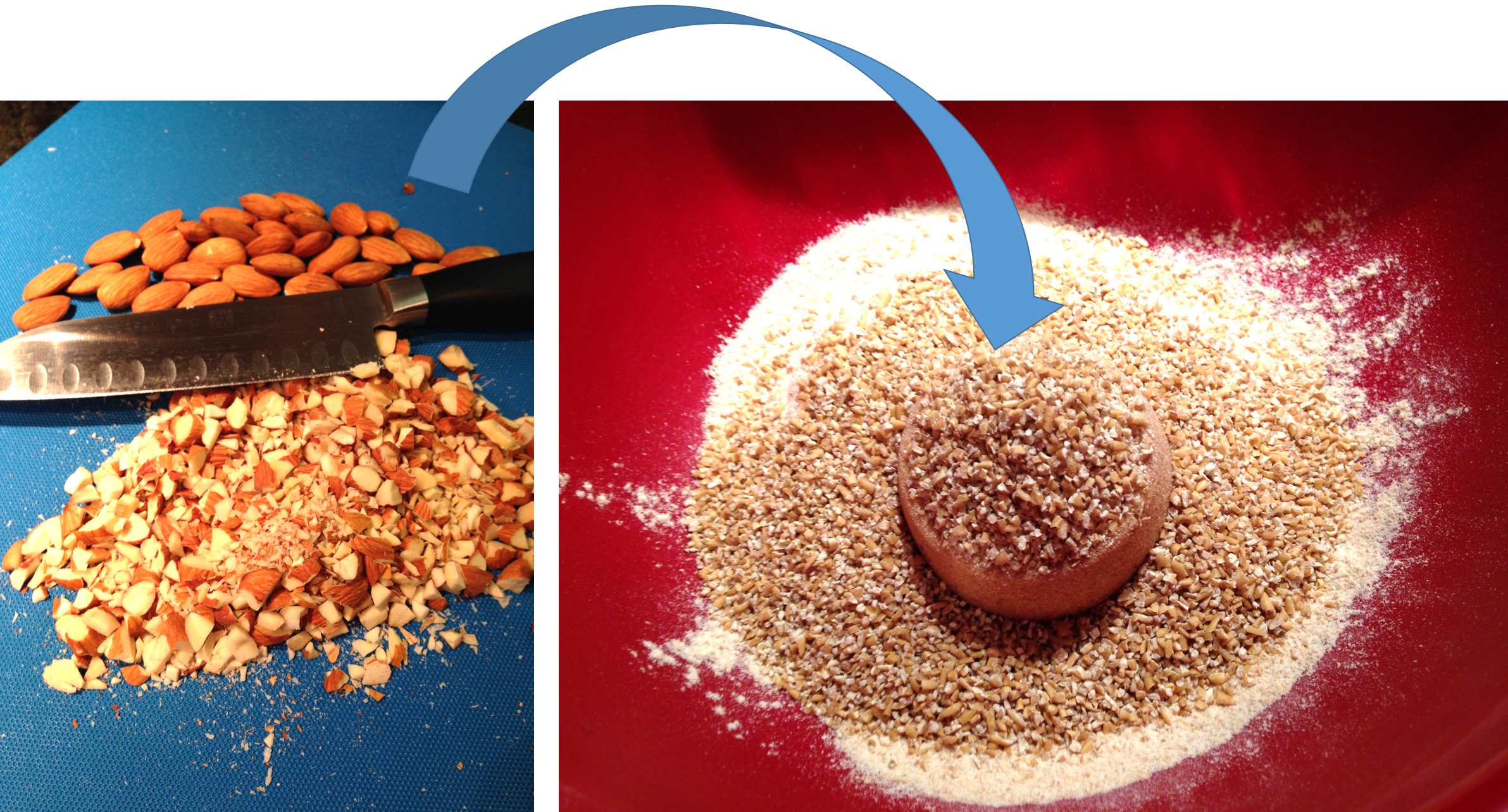 1. Preheat the oven to 350 deg F. To make the crumble, chop up the almonds into small bits. Mix together the flour, brown sugar, oats, almonds, salt, and nutmeg.
