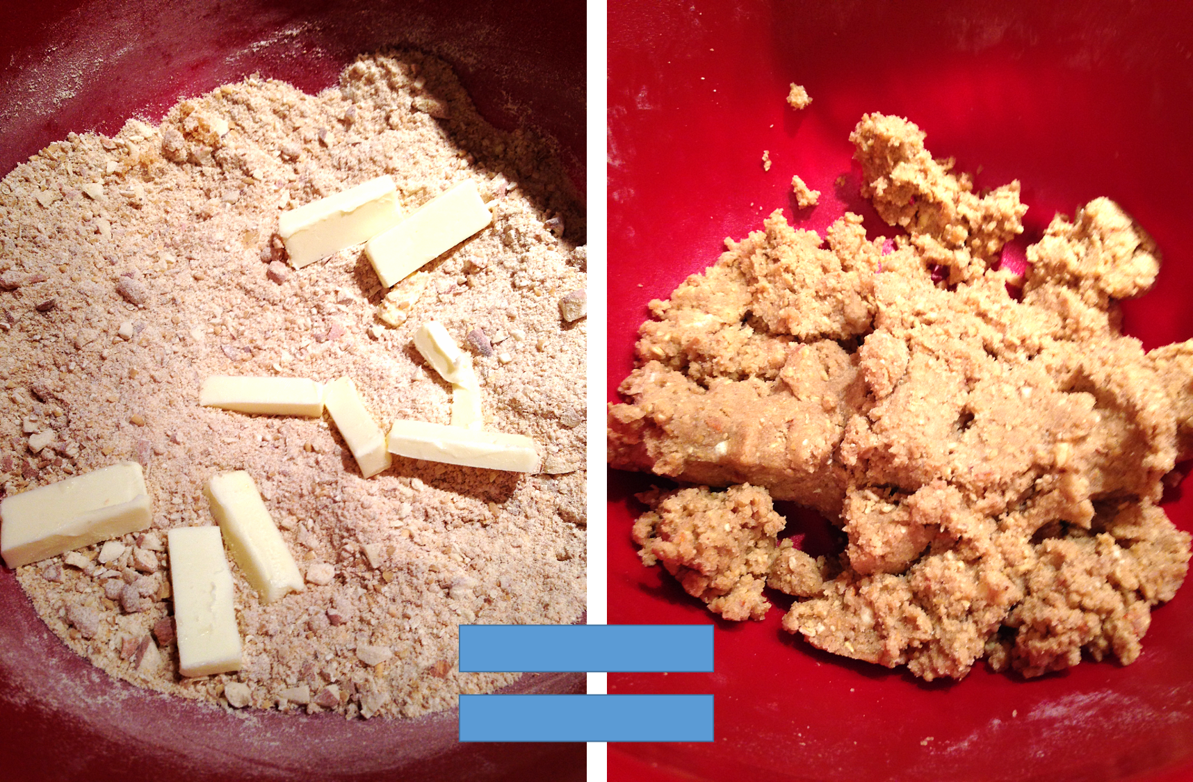 2. Slice up the butter into small pieces and mix in with the dry ingredients. Use your hands to create a cookie dough like consistency. Place in the fridge while you work on your berry mixture.