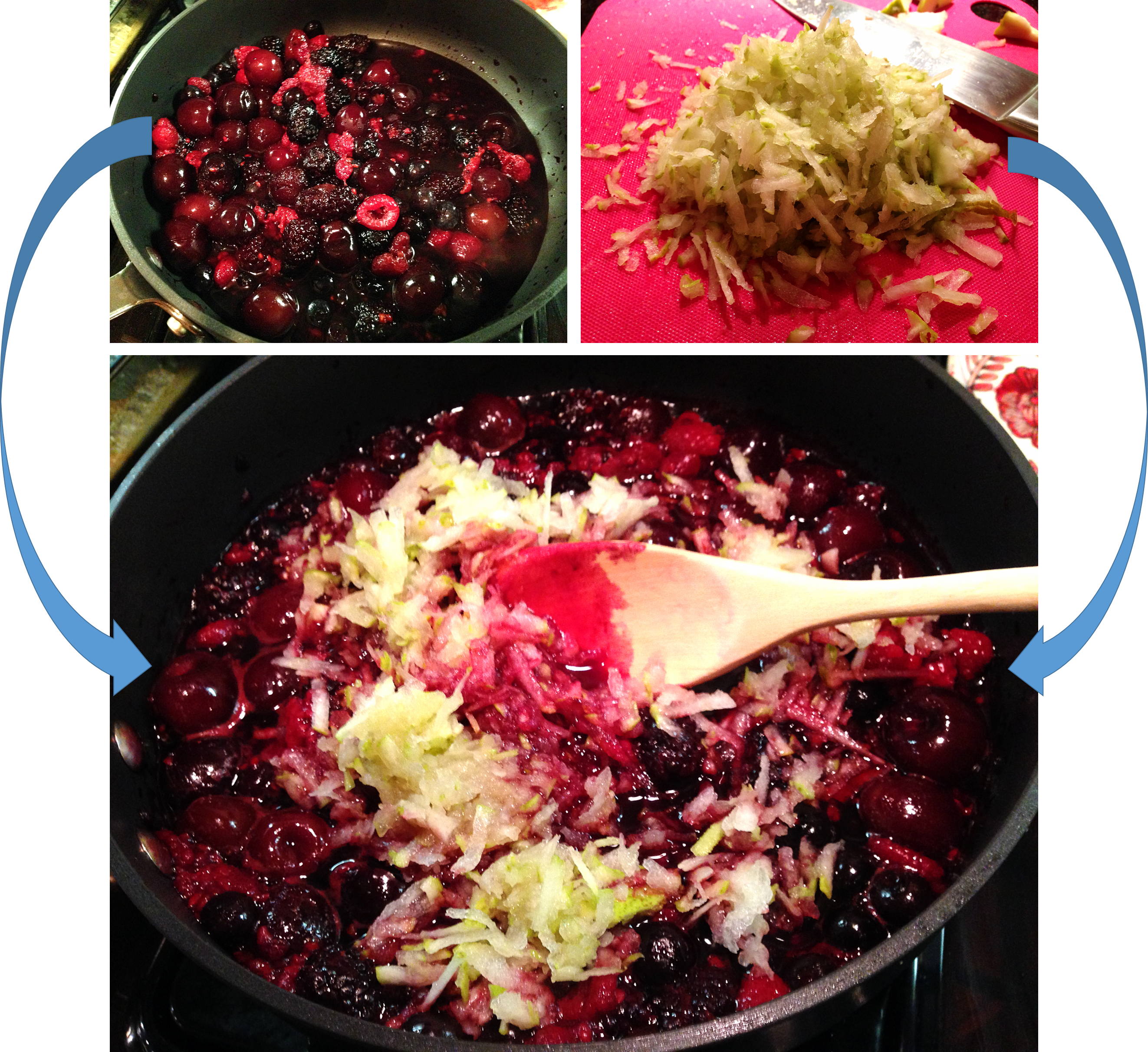 3. In a large pan, heat the berries, sugar, balsamic vinegar, and vanilla on medium heat. Continue to stir until the berry juice is bubbly and steaming (about 5 minutes). While the berries are heating up, use a large box grater to shred the pear. Add the pear to the berry mixture after it is at it’s bubbly state and let the mixture cool.