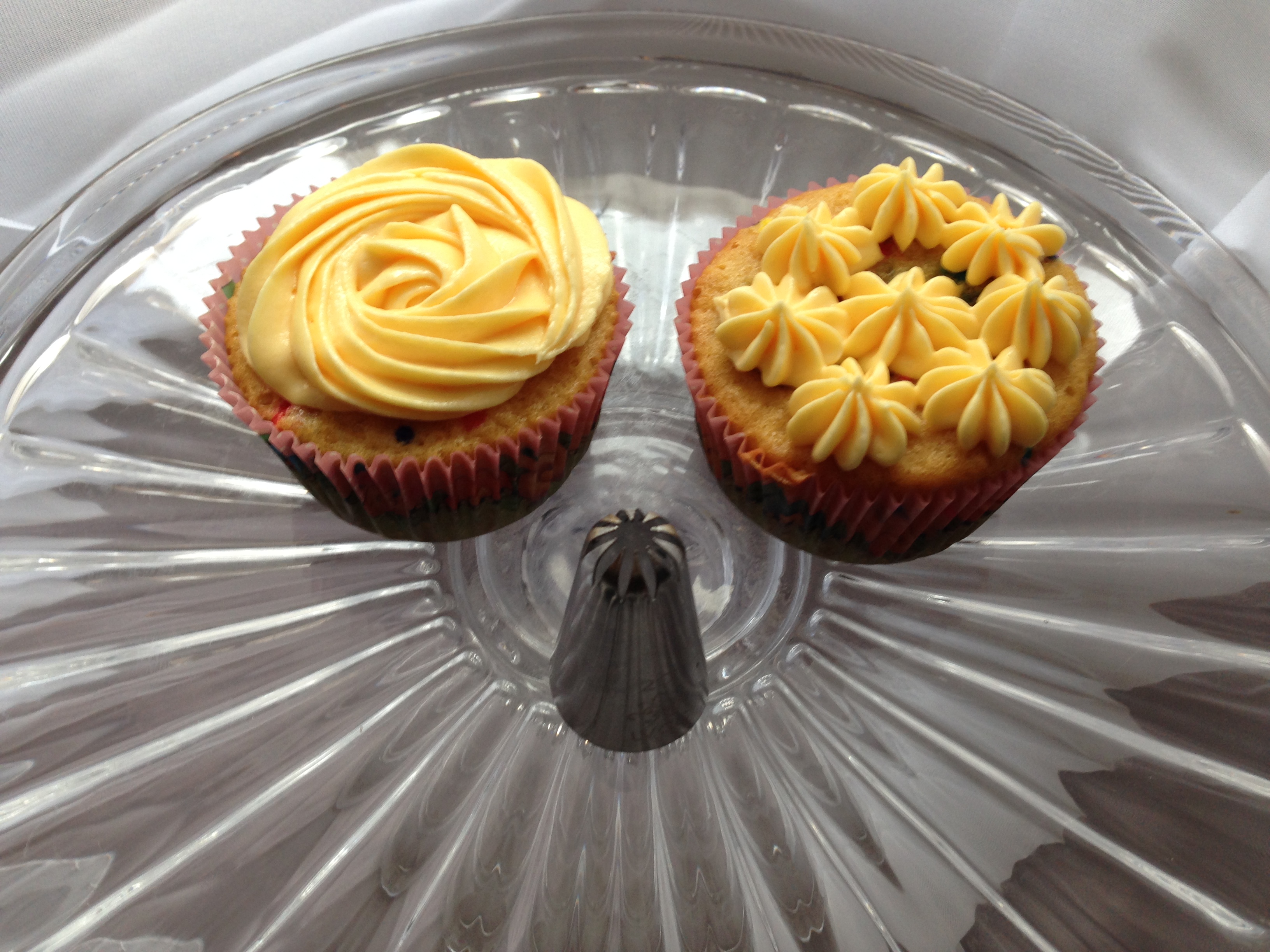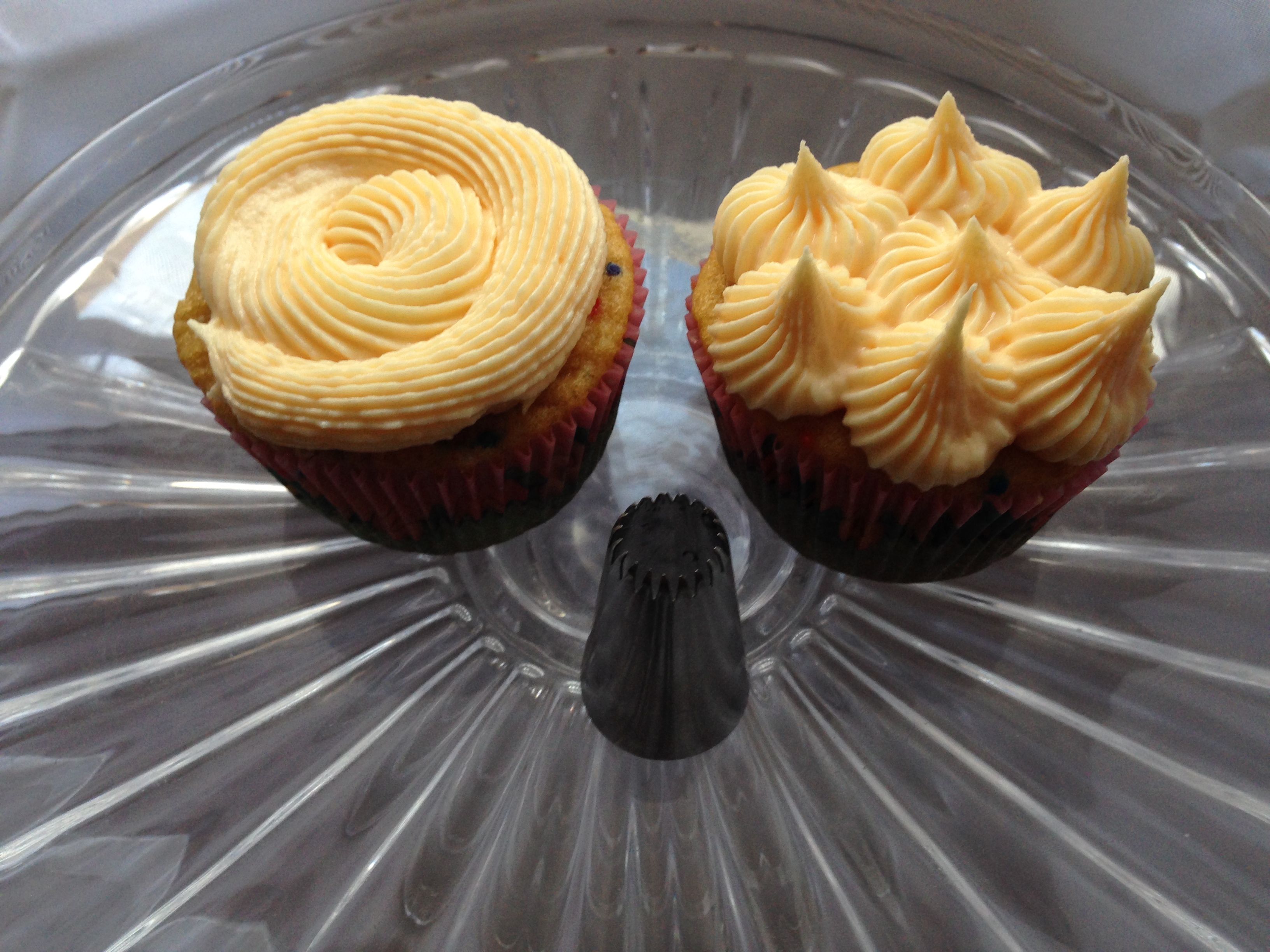 The french tip is the one that looks a bit like a sun. The versatility of this tip is better seen on a large cake where it can be used to line the edges with shell like patterns. This is what you see on most of the cakes you buy in the grocery store. The french tip can be used similarly to the large round tip to create swirls and peaks. You can also use it to make a textured swirl that doesn’t look so much like a flower if you’re trying to avoid that look.