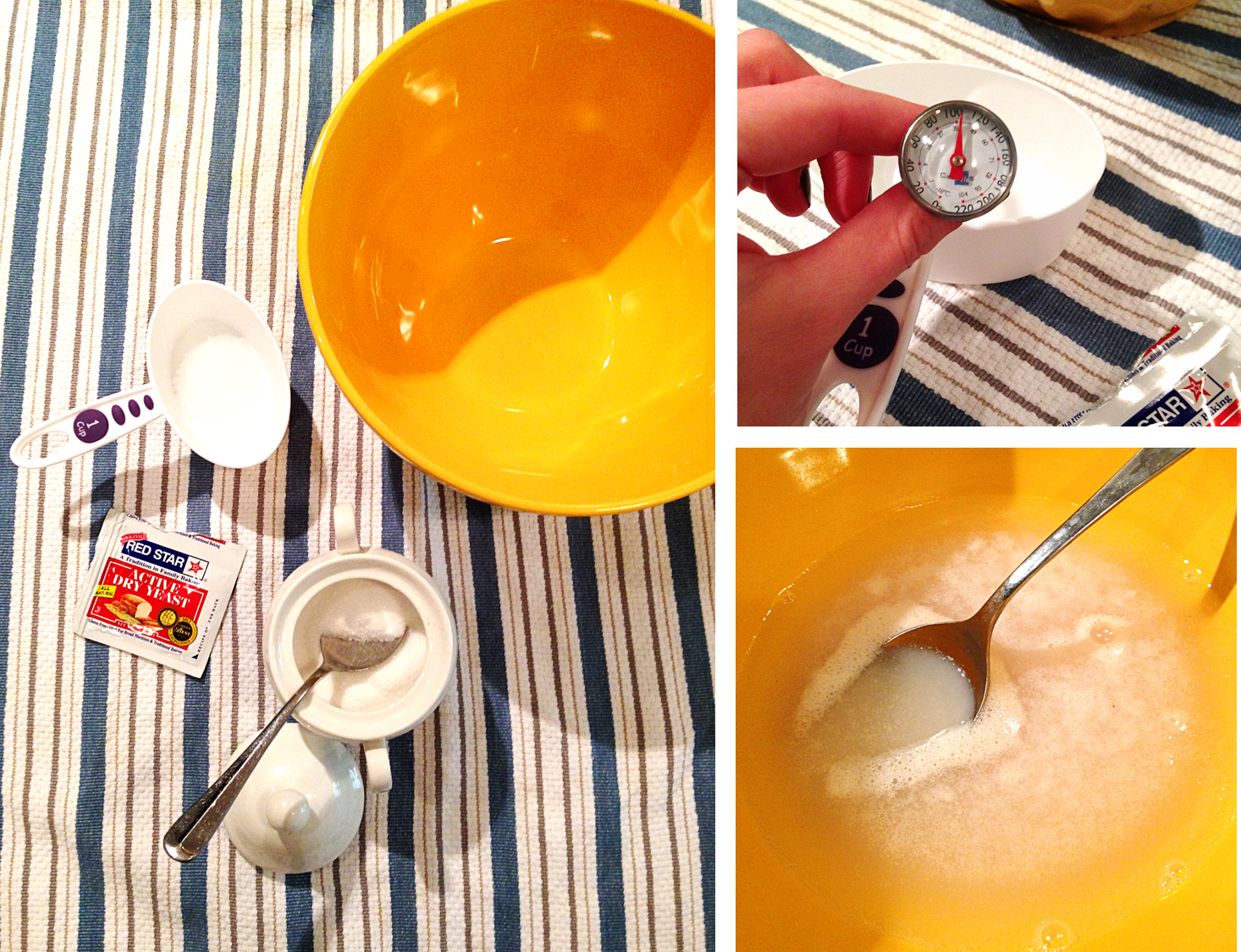 Place the yeast and sugar into the bowl with the water. Stir the yeast up a bit and wait about 10 minutes until you see small bubbles forming which means the yeast has activated. You don’t need a lot of bubbles, but if none form, your water is too hot, too cold, or the yeast is dead which happens when it is old. This took me a few tries to get down. Three to be exact. Thankfully you only need half a packet of yeast for all of this bread and it’s about a dollar for 3 packets! Another tip to keep the water warmer is to place it in the sun while it’s activating. Thankfully Houston is blazing hot so I was able to keep my water good and toasty.