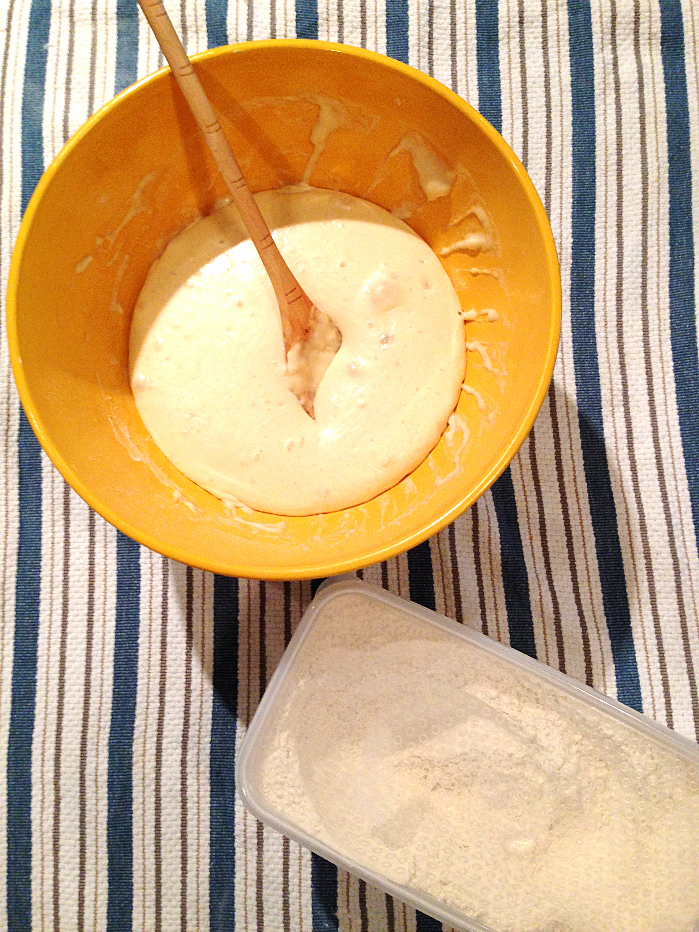 2. With your yeast activated, it’s time to start adding your bread flour. You can also use all purpose flour to make bread, but the bread flour works so much better (extra gluten = fluffier bread!). Add about 1 1/2 cups of bread flour to the water along with the salt. Now you beat the bread 100 times…that’s right…100. I don’t know why that’s the magic number, but it sure works! Wet a dish towel and wring it out. Cover your bowl with the dish towel and allow the dough to sit 1 hour in a warmish place. This keeps the dough from drying out and helps it to expand. And when I say a warm place, basically if you’re baking and it’s very cold out, make sure you wrap the bowl in a blankie or place in the oven on the warming setting.