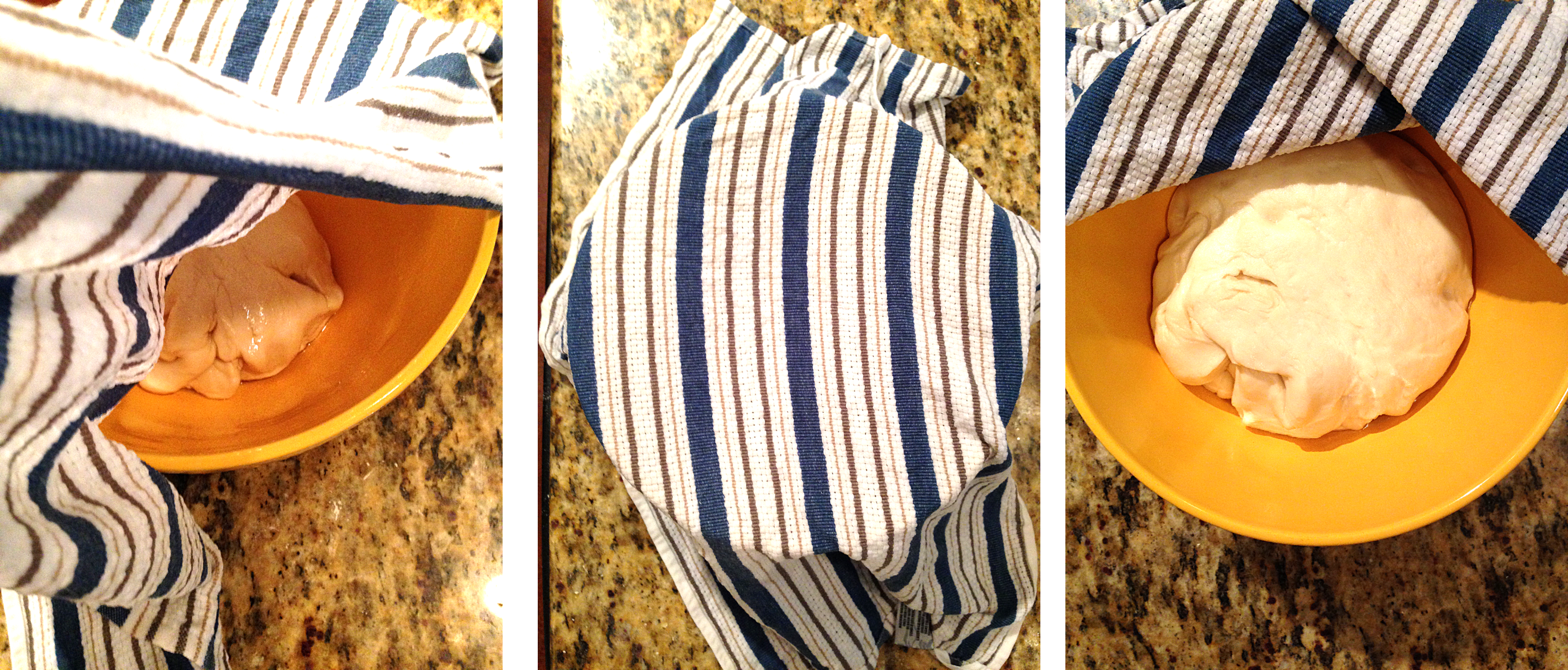 4. Put the dough back into the bowl and coat in another 1/4 cup of oil. Cover with a moist towel again and let it rest for 45 minutes. After an hour, the dough will have risen again even more than the first time. Now punch the dough! Legitimately punch it down and it will deflate like a balloon. Again, cover with the wet cloth and let rise for 45 more minutes.