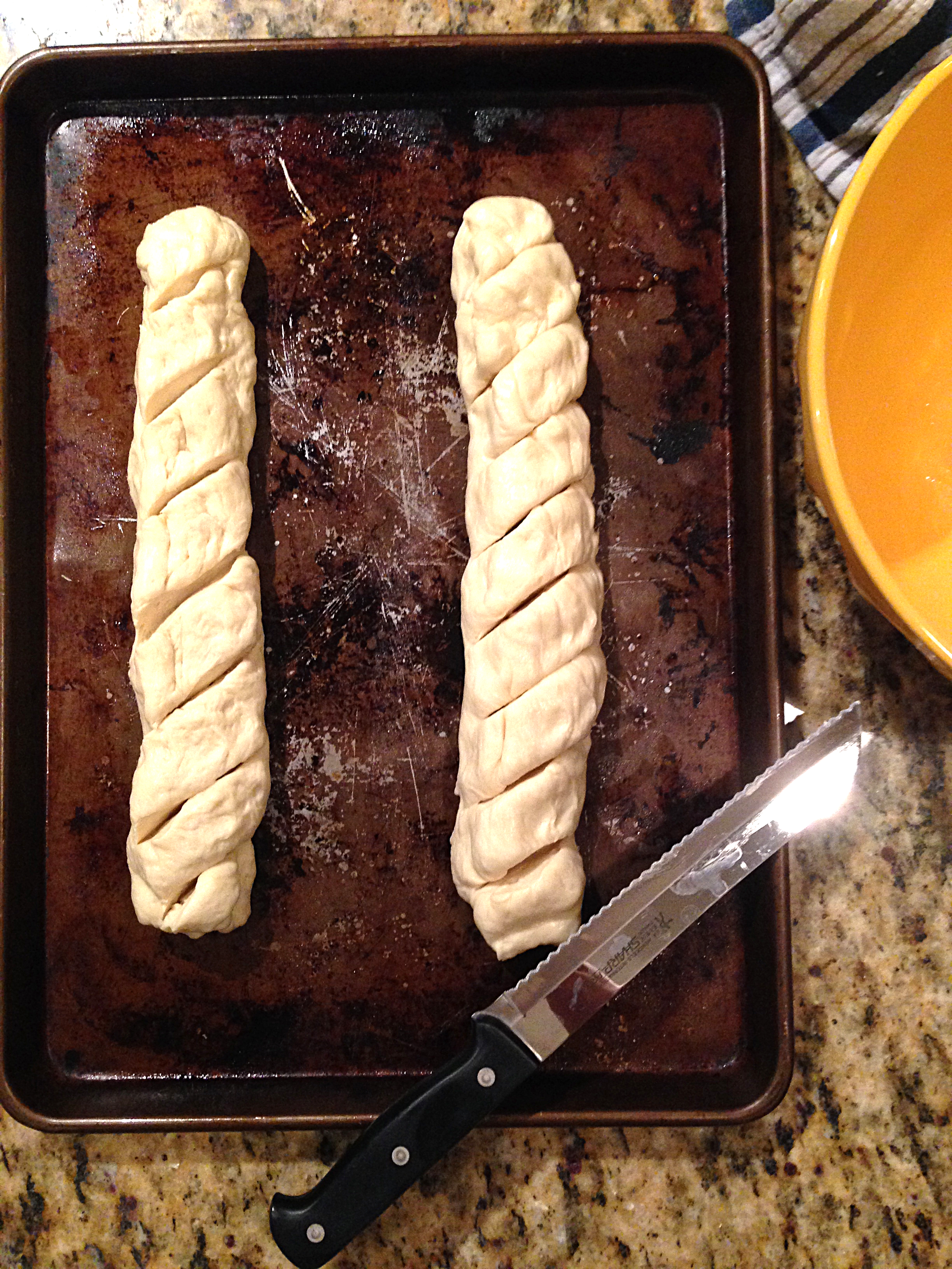 5. Prep a cookie sheet for your fabulous loaves by coating the surface with a little more oil. Take your dough and split it into two pieces. Form two long loaves about 3-4 inches apart on the pan. You’ll have to stretch the dough quite a bit to get it into a longer shape. Use a bread knife to make slits in the top of the bread loaves at an angle about an inch apart and 1/2 inch deep to give it that professional bakery look! Let the bread loaves rise for 30 minutes.