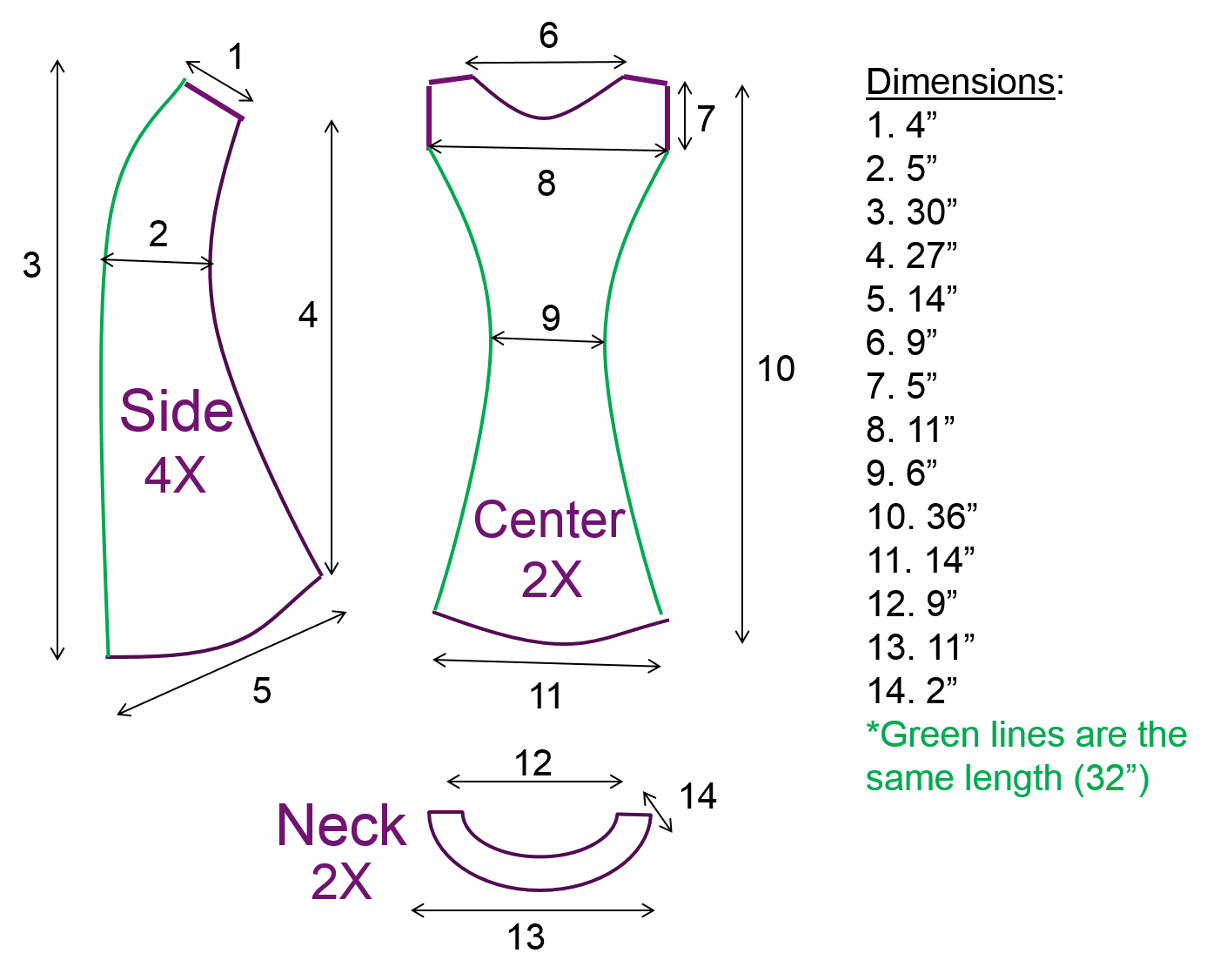 1. Use some paper, a pencil, and some tape to make the three pattern pieces shown below. Make sure you also make 2 “Side” pattern pieces. Fold your 2 yards of fabric in half and pin your “Center”, 2 “Side”, and “Neck” patterns on to it as shown. Use your scissors to cut along the pattern edges, and then unpin the patterns from the fabric.