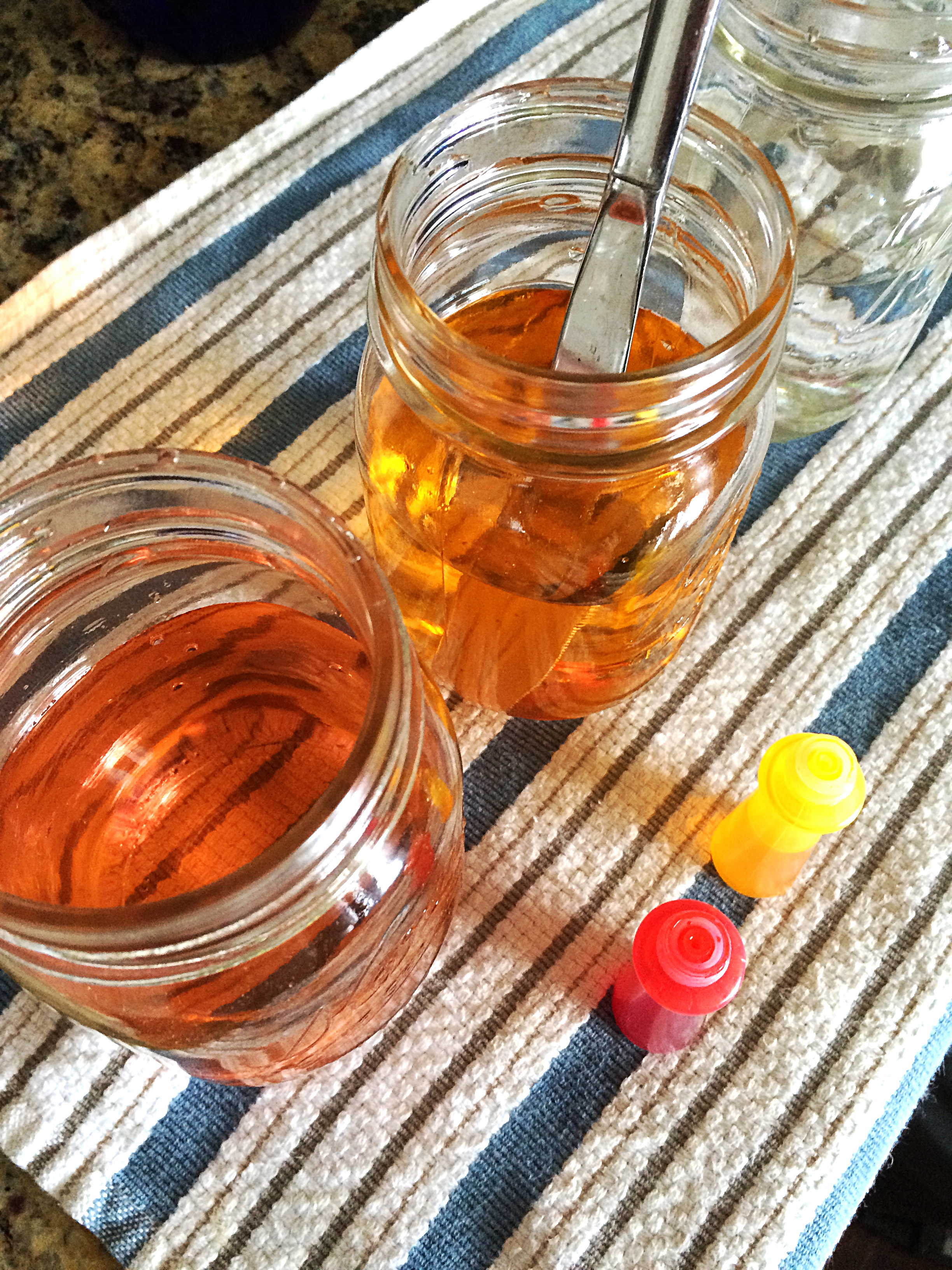 1. Fill your mason jars halfway with water. To create the rainbow colors, add the following drops of food coloring to each jar and stir combine: