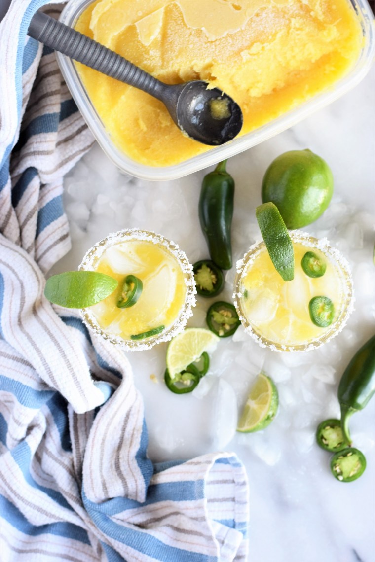 I actually had intended to serve this as a pineapple sorbet with the alcohol poured over it, but the liquids melted the sorbet almost immediately. Instead, this drink can be easily self served by your guests by just mixing the ingredients into a cup, no shaker or blender needed. Set out the sorbet with a scoop and have your guests add in the classic lime juice, tequila, and triple sec. Top with jalapenos, and you have the most perfectly balanced and flavorful margarita around.