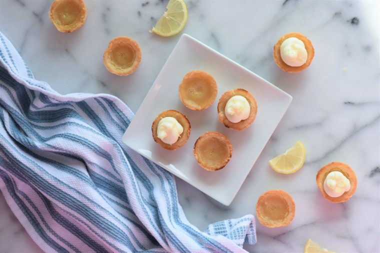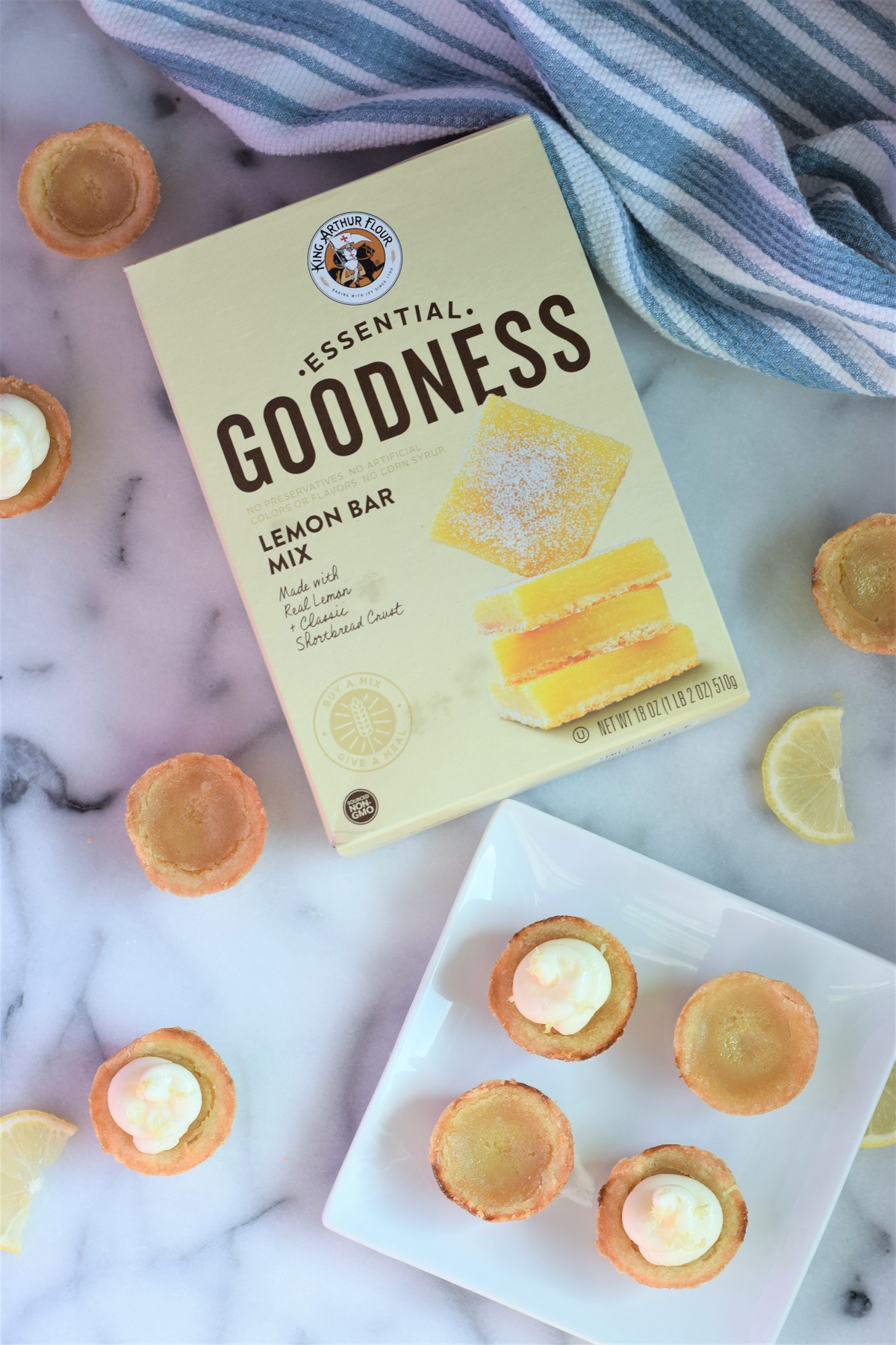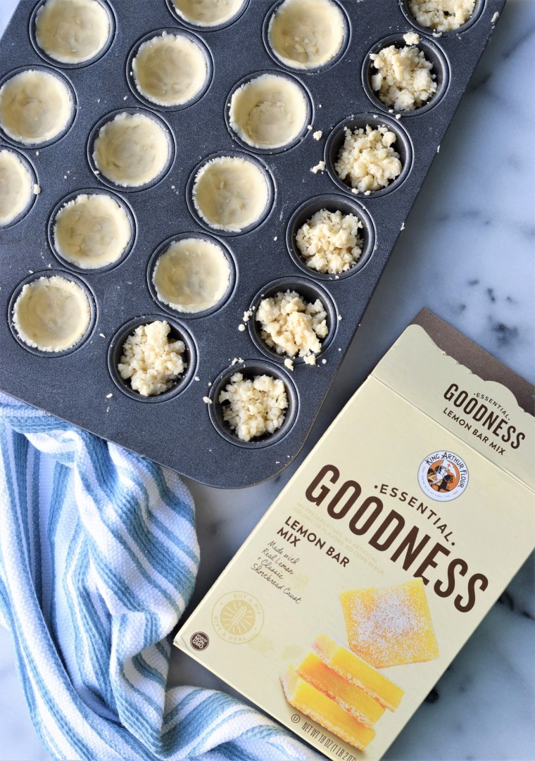 1. Preheat the oven to 350 deg F. Lightly grease a 24 mini-cupcake pan. Start by making the crust from the Essential Goodness Lemon Bar Mix following the directions on the back of the box. Press the mixture into the 24 cupcake cups with the crust covering the bottom and sides of the cups. Bake cups for 10 minutes, or until golden brown on the edges.