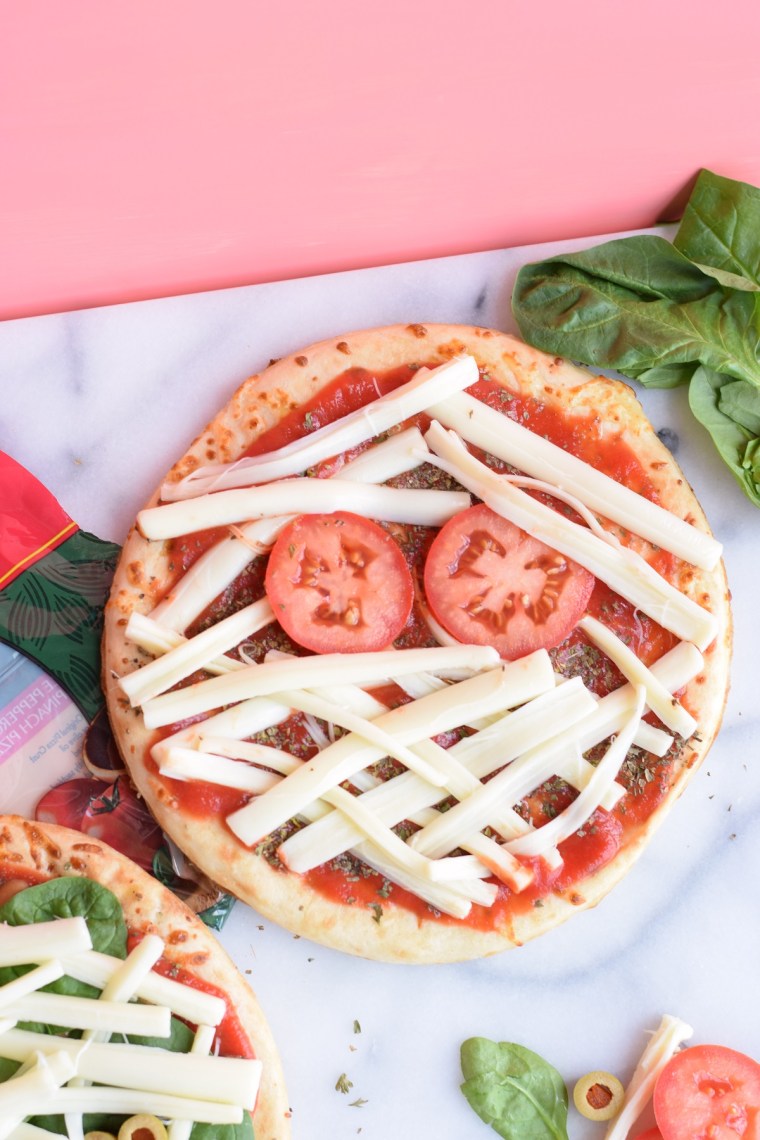 I started by using these Boboli mini pizza crusts that came in my Degustabox this month. (Try out Degustabox for half off this month using my code: WTQER.) Top your pizza’s with your favorite sauce and toppings, and then cover the top with strands of string cheese to look like mummy wrappings! Make eyes out of pepperonis, olives, or whatever round topping you like. TOO FREAKING CUTE.