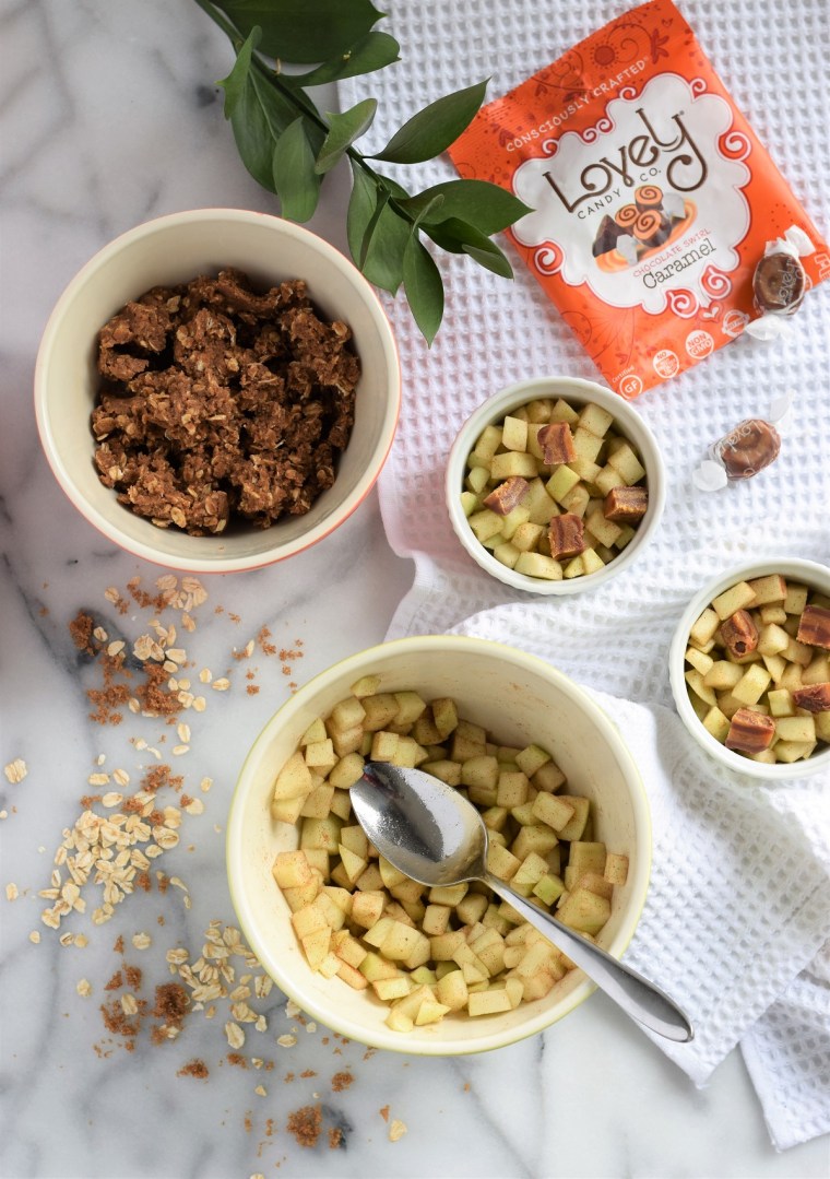 Onward, the recipe! In order to mix two of my favorite apple goodies, caramel apples and apple crisp, I came up with this caramel apple crisp. The apple crisp portion of the recipe is pretty classic: Granny Smith’s peeled, chopped, and mixed with sugar and spice, plus a topping with a balanced mix of spices with an oat heavy topping – I like a bit of crunch to my crisp. What makes these little guys so special is that they have a touch of gooey decadence from the caramels inside.