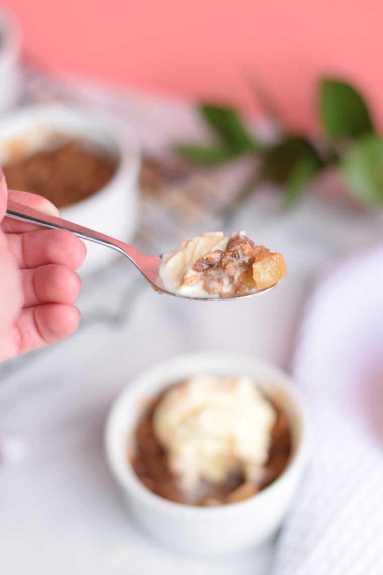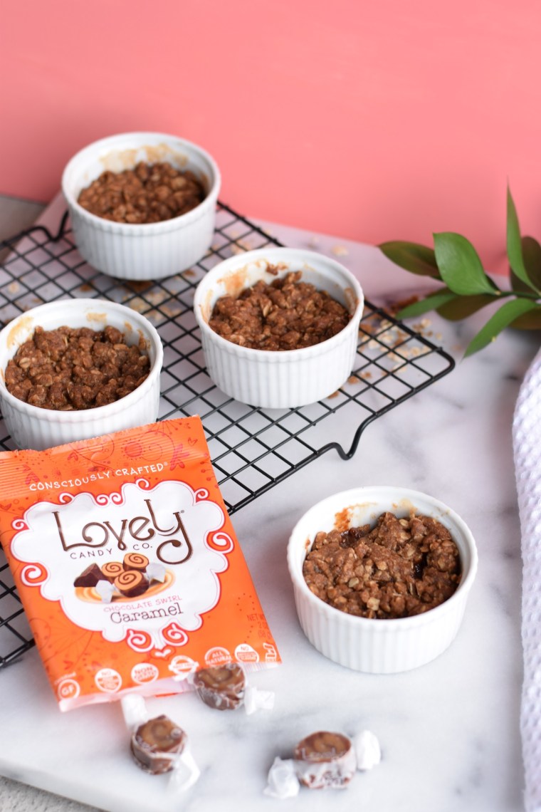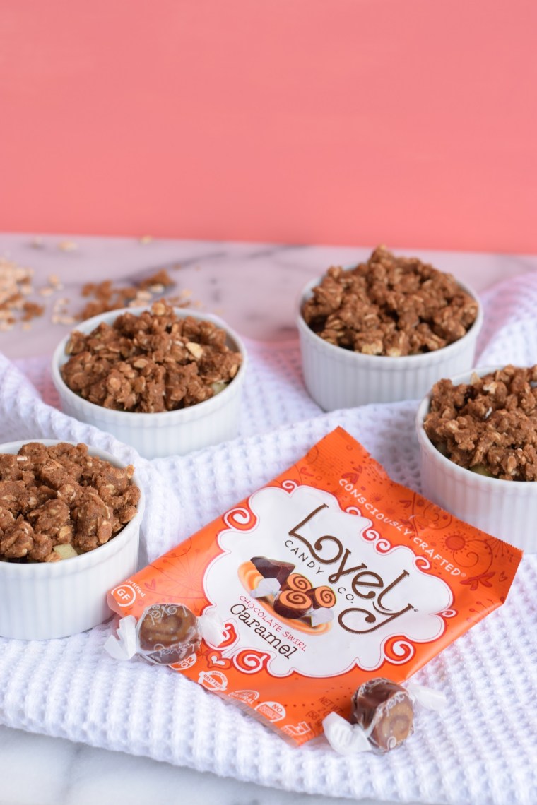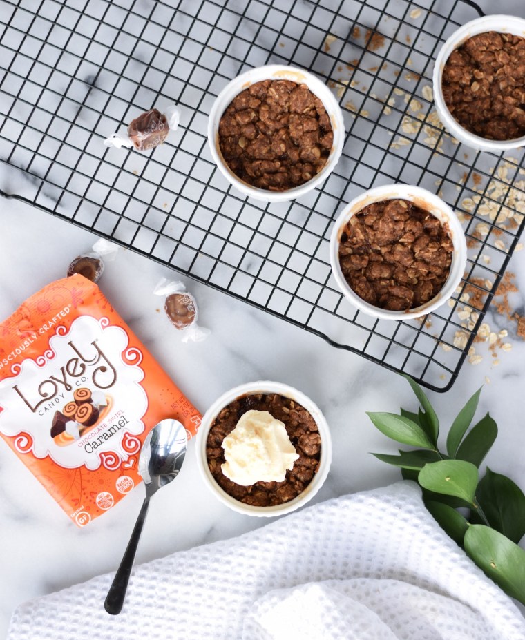 I got these Lovely Candy Co. chocolate caramels in my Degustabox this month (try out Degustabox for half off this month using my code: WTQER) and knew that they belonged in this recipe. They seep into the apples and combine with the topping to add a richness to the recipe. Topped off with vanilla ice cream, you really can’t go wrong.