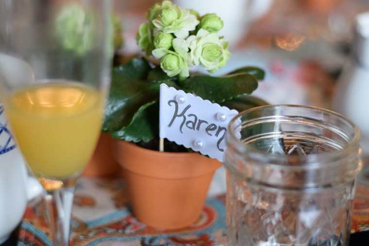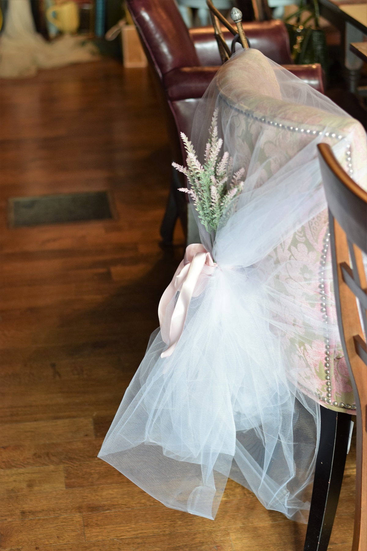 On the table we set little flower pots with peoples’ names to signify where they would sit, which also doubled as a cute favor to take home at the end of the party. A big tulle bow was tied to the back of the bride’s chair with a sprig of flowers tucked in, and we made a sign for her out of doilies. We also put strips of cute paper and pens at each seat so that people could write down date ideas and marriage advice that the couple could use over the years!
