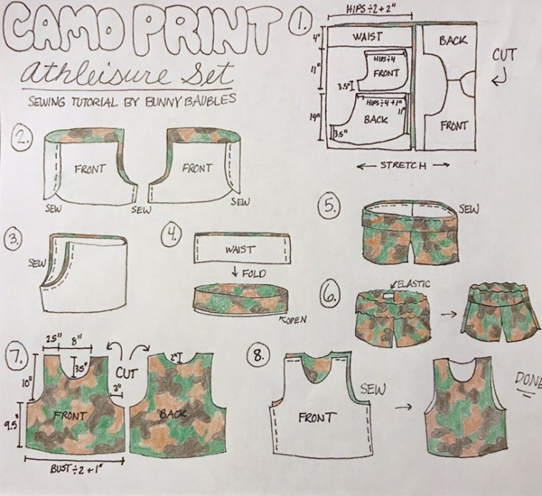 If I was going to commit to camo, I was going to commit to pretending to have any semblance of being rugged. In order to add to the charm of the shorts, I thought it would be fun to add an exposed hem to the design, thus making them even easier to sew. Instead of lining up the side seams of the shorts with the right sides of the fabric matching, I overlapped them to allow the curved edge to show. I also left the sleeves and bottom edges of the tank and shorts exposed to match the sides since this stretch material won’t shed all over the place.
