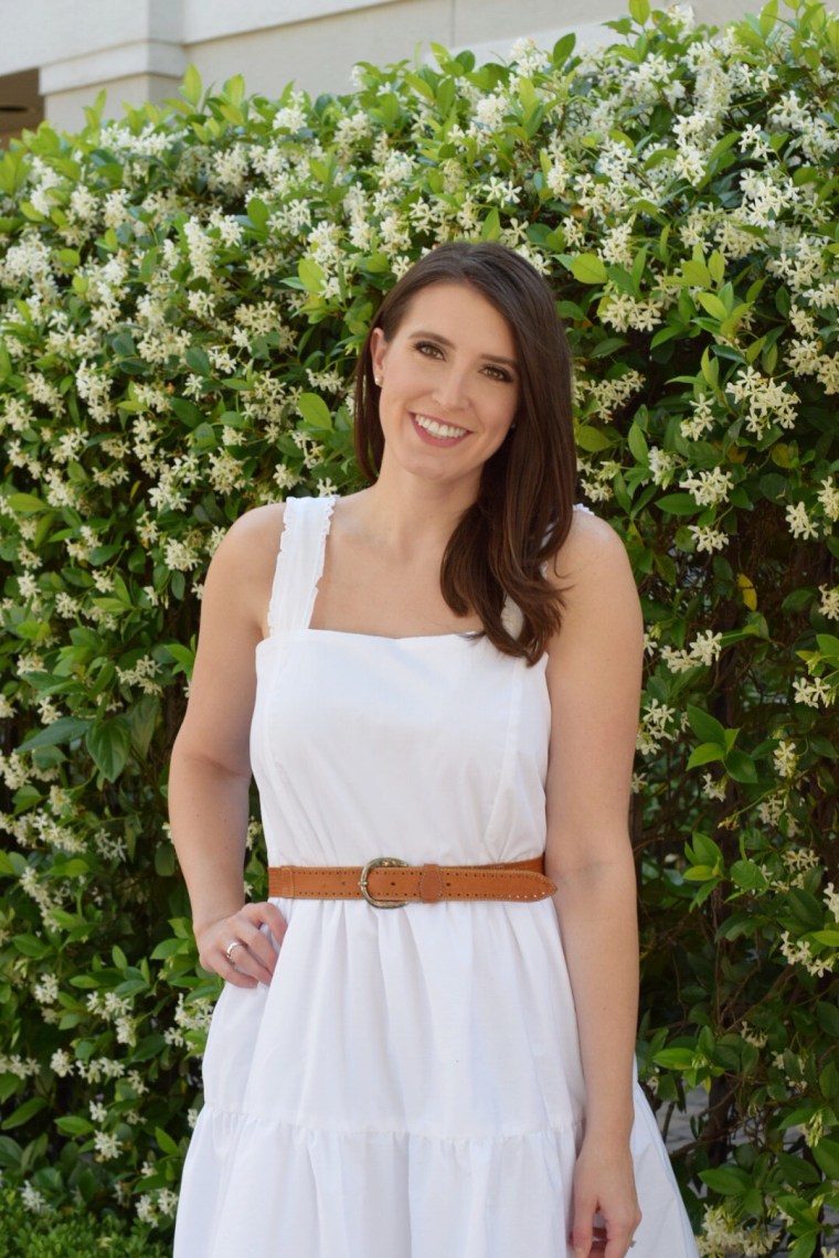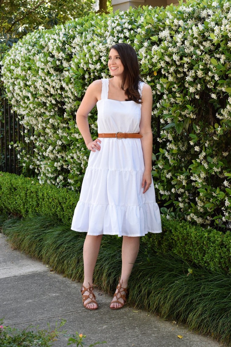 I found one I loved, but it was $180, so it didn’t really feel a match. Instead of continuing my search, I designed one that is perfect for summer and any bridal occasion you can think of! It has a full, tiered skirt and a fitted bodice. The cutest little straps add for a fun detail, and I realize now that I fully copied them from Julia Engel’s Gal Meets Glam collection dress that is too cute not to love!