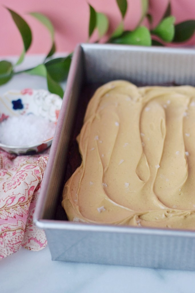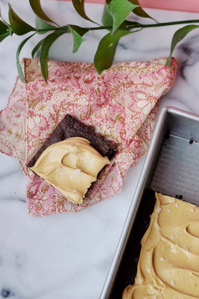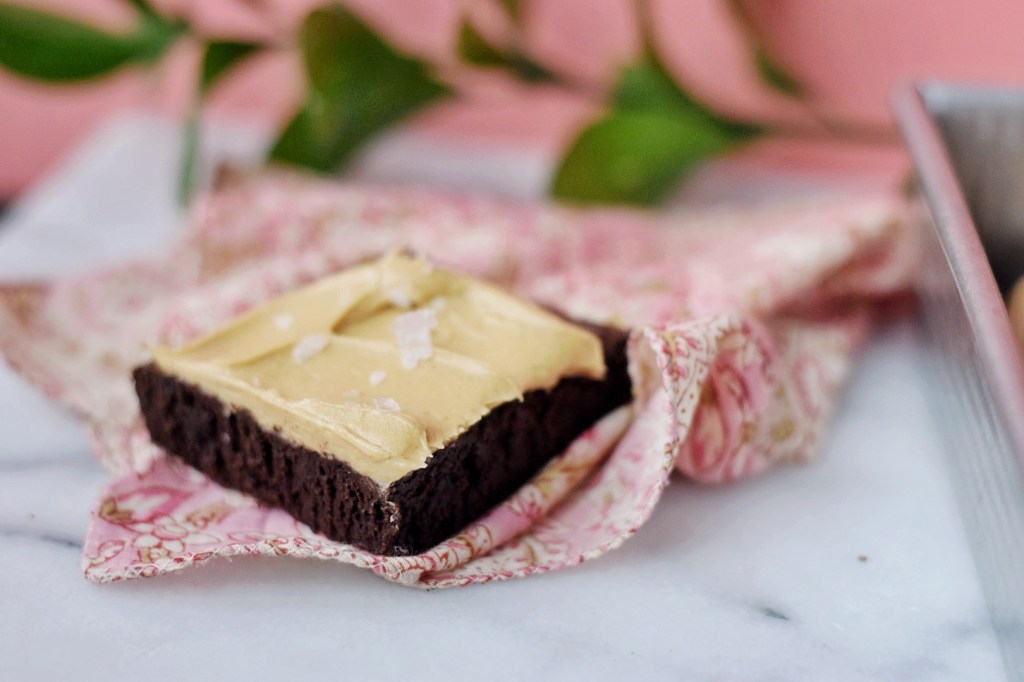 Brownies: 3/4 cup Butter 3 ounces 70% or darker Chocolate with Espresso or Coffee flavor, chopped 1 1/4 cups Sugar 1 Tbs. Vanilla 3 Eggs 3/4 tsp. Salt 1/2 tsp. Espresso Powder 1/2 cup Cocoa Powder 1/2 cup Flour Salted Peanut Butter Frosting: 6 Tbs. Butter 3/4 cup Peanut Butter 1/2 cup Powdered Sugar A few pinches of Flaked Salt 1. Preheat the oven to 325 deg F. Spray a 9″x9″ baking pan with cooking oil. 2. Melt the butter in a medium saucepan over medium-high heat. Cook the butter until it begins to smell nutty and turn brown in color, stirring continuously as the butter begins to brown. Remove the pan from heat and pour the butter into a medium bowl. 3. Add the chopped chocolate to the bowl with the butter and stir to melt. Add in the sugar and vanilla while the butter is still warm and stir vigorously to combine. 4. Add in the eggs, salt, and espresso powder and stir to combine. Add the cocoa powder and flour into the chocolate mixture and stir until just combined. 5. Pour the batter into your prepared pan and bake for 25 to 30 minutes, or until a toothpick inserted into the center of the pan comes out clean. Cool on a wire rack. 6. While the brownies are cooling, make your salted peanut butter frosting. Warm the butter to room temperature and whip it until smooth and light. Add in the peanut butter and powdered sugar, and whip until combined. 7. Frost your brownies once they have cooled and sprinkle with flaked salt.