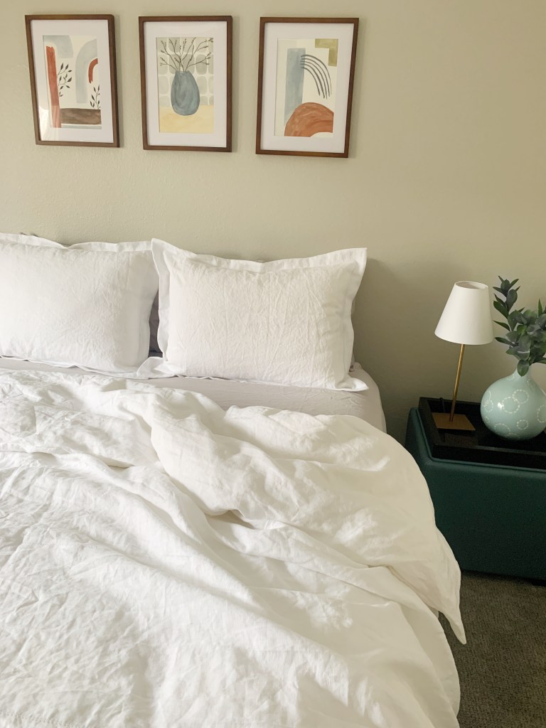 The next step was adding a linen duvet and shams. Linen has become so trendy as it is breathable, beautiful, and has a laid back vibe that just makes you want to dive in to bed. Though Fabric Wholesale Direct has a ton of colors available, I decided that white was fresh and inviting. Due to the restraints of the fabric size, the duvet pattern is made from multiple strips of linen across the topside. Though you can make the top side in just a few pieces of fabric, adding multiple stripes makes it look more intentional. The bottom side is made with cotton sheeting. This has a similar feel and look to linen, but is much cheaper, and allows you to save some money on the side of the duvet that no one sees!