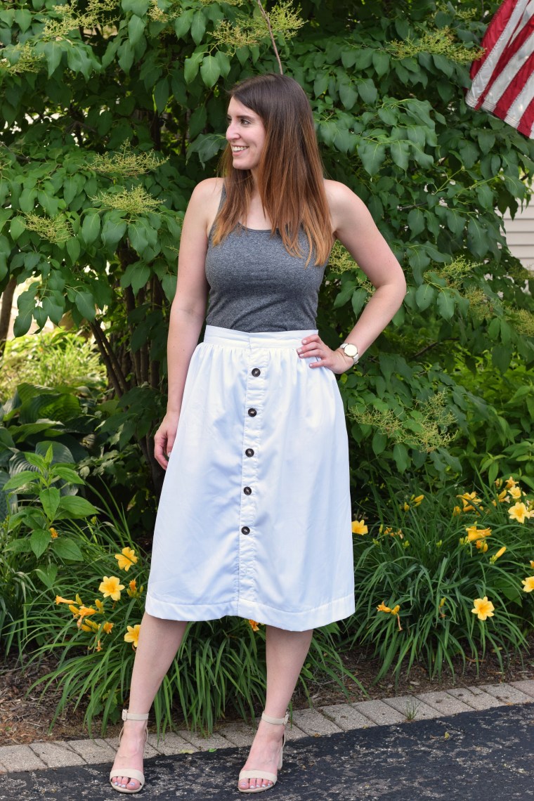 Happy (late) Summer!! It’s been a light month for posting for me since my brother got married and I was preoccupied cutting squares of fabric to cover little jam jars as favors, but I managed to sneak in a really adorable new sewing project! This button front midi skirt is my new favorite wardrobe staple.